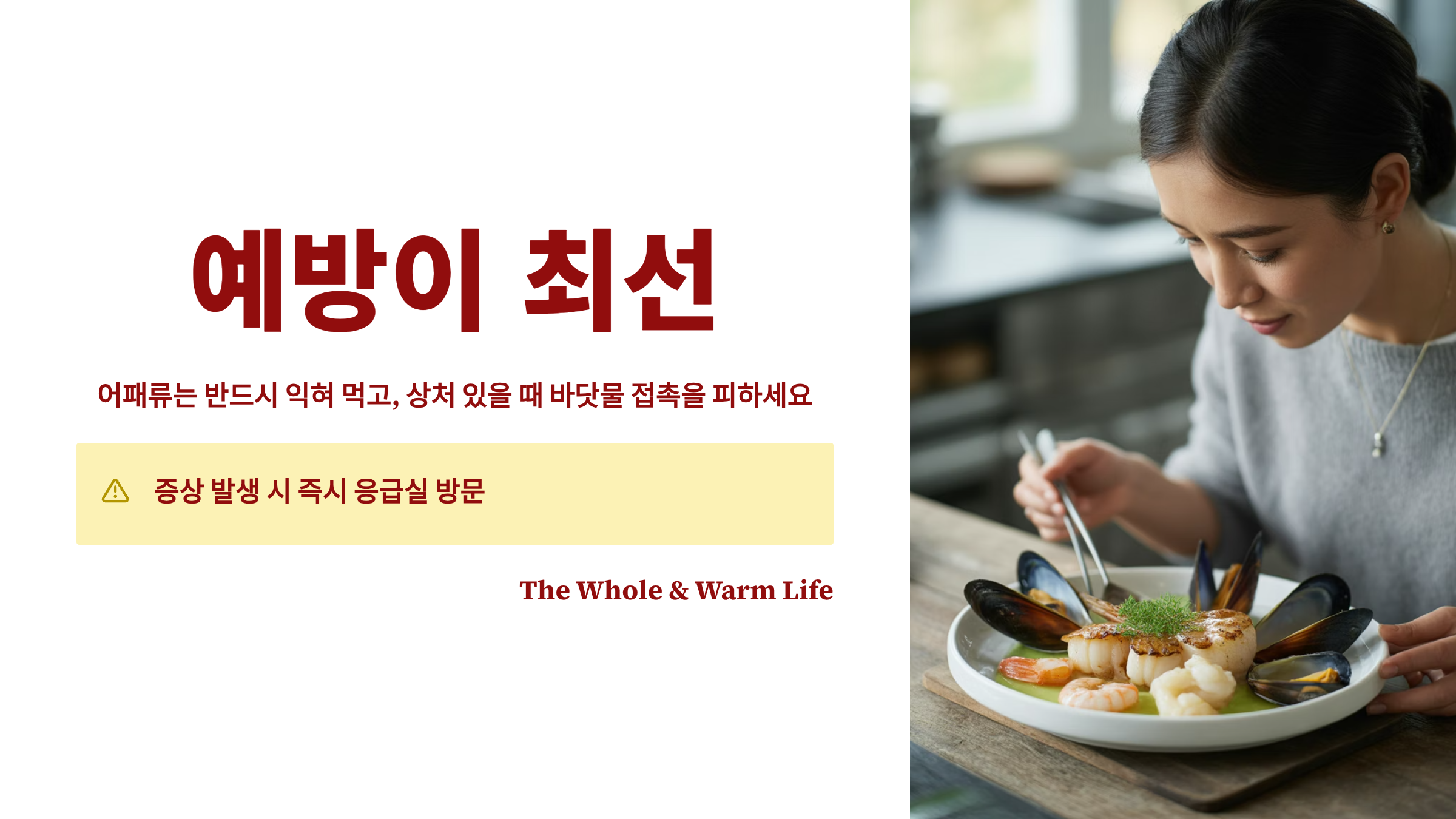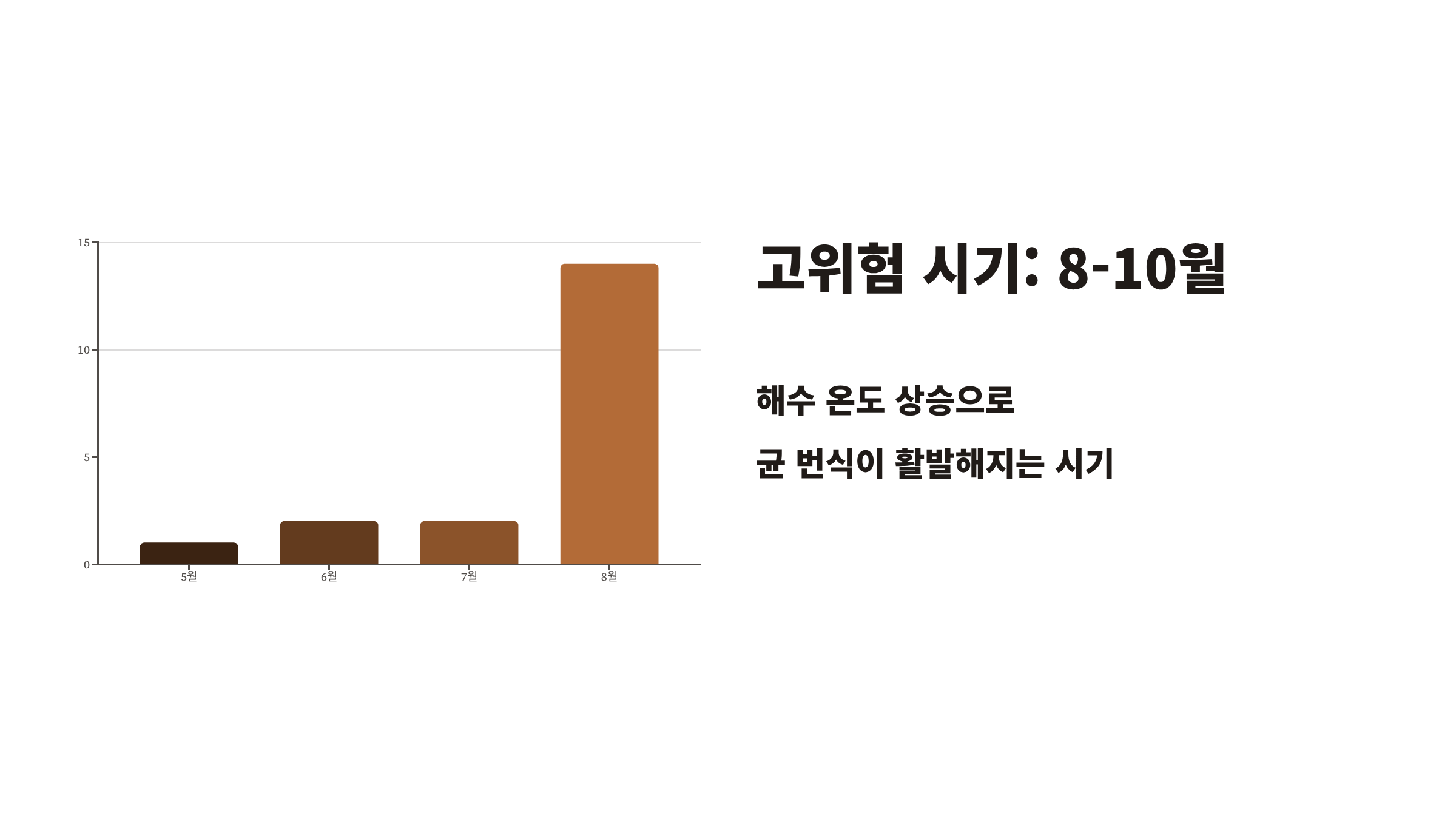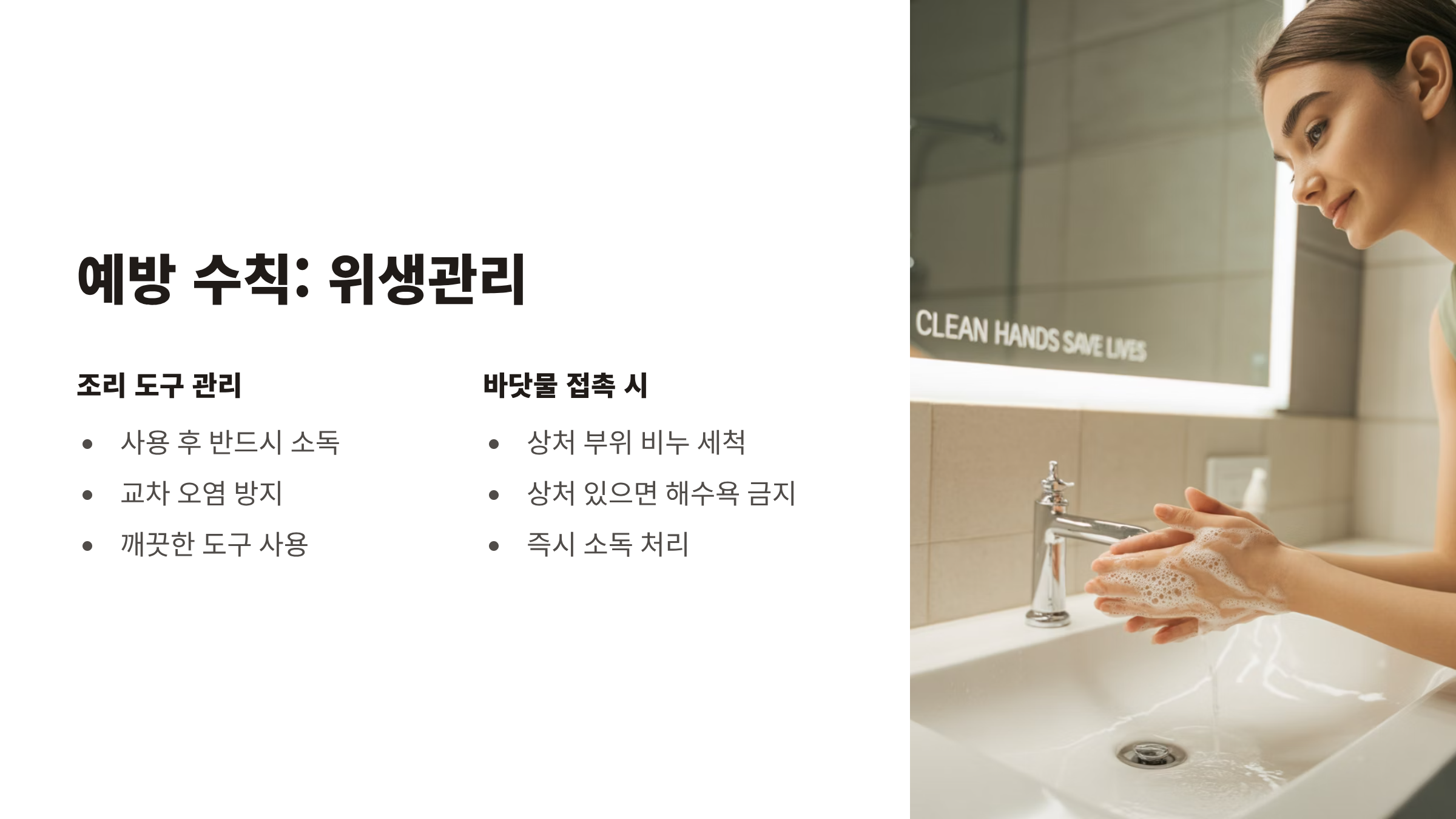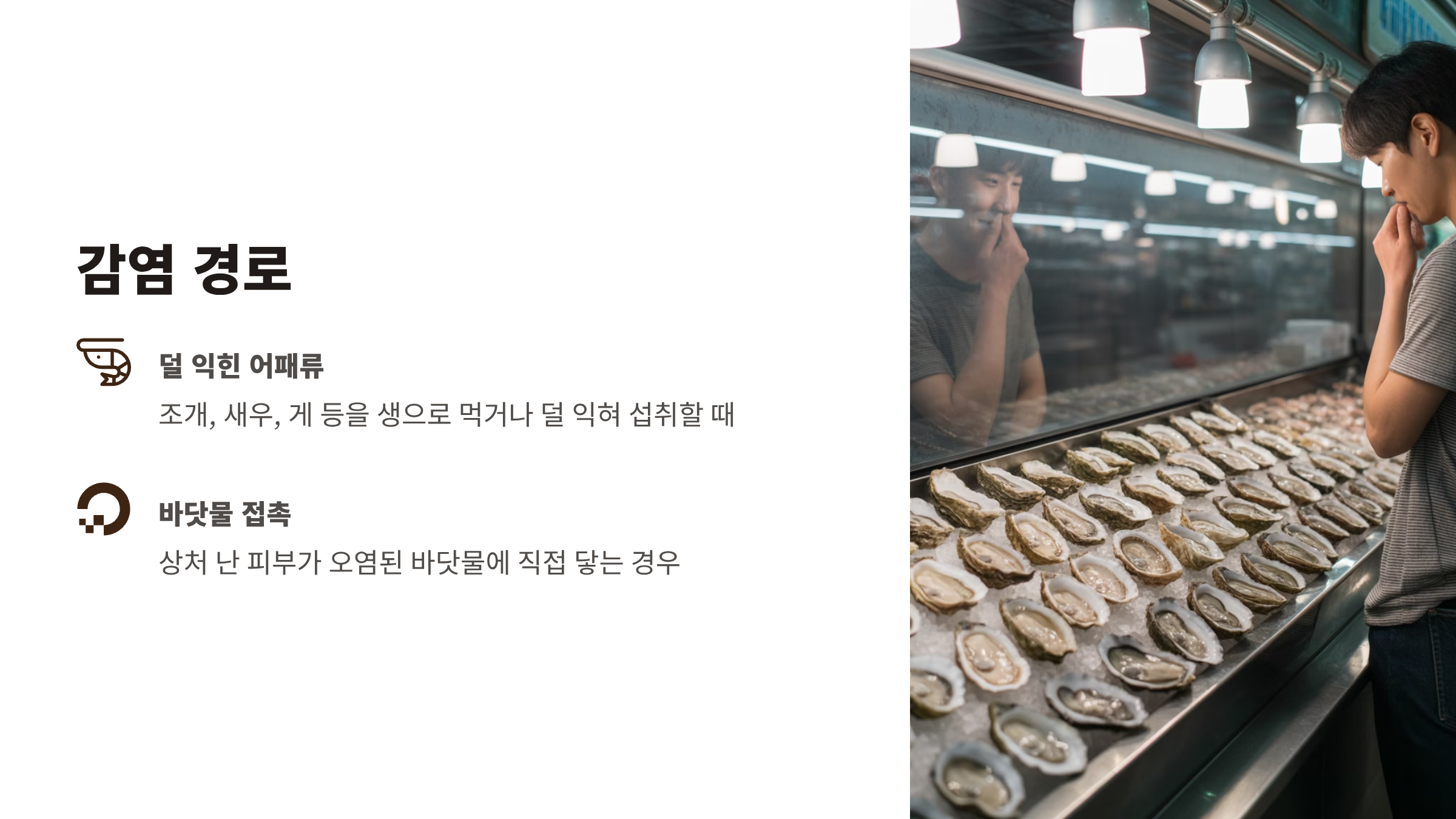 - 기저질환자는 날것 섭취 및 해수 접촉 피하기