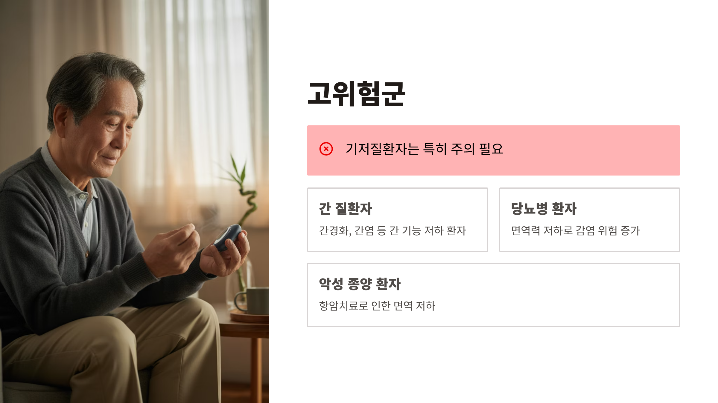 특히 간 질환이나 당뇨병 환자 등 고위험군은 더욱 각별히 주의해야 합니다.