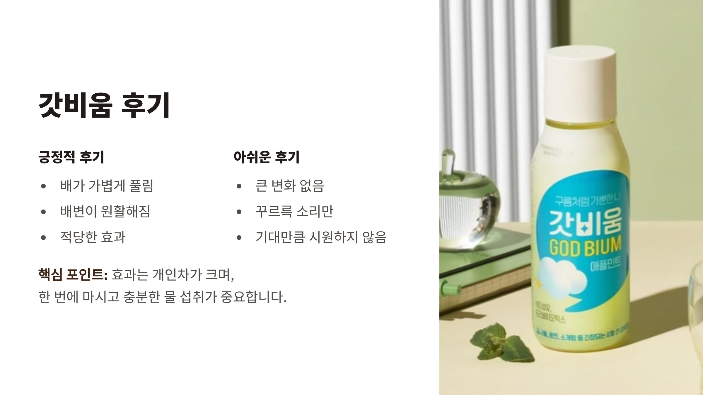 갓비움은 간편하게 구입할 수 있는 변비 보조 음료로, 효과는 분명히 있으나