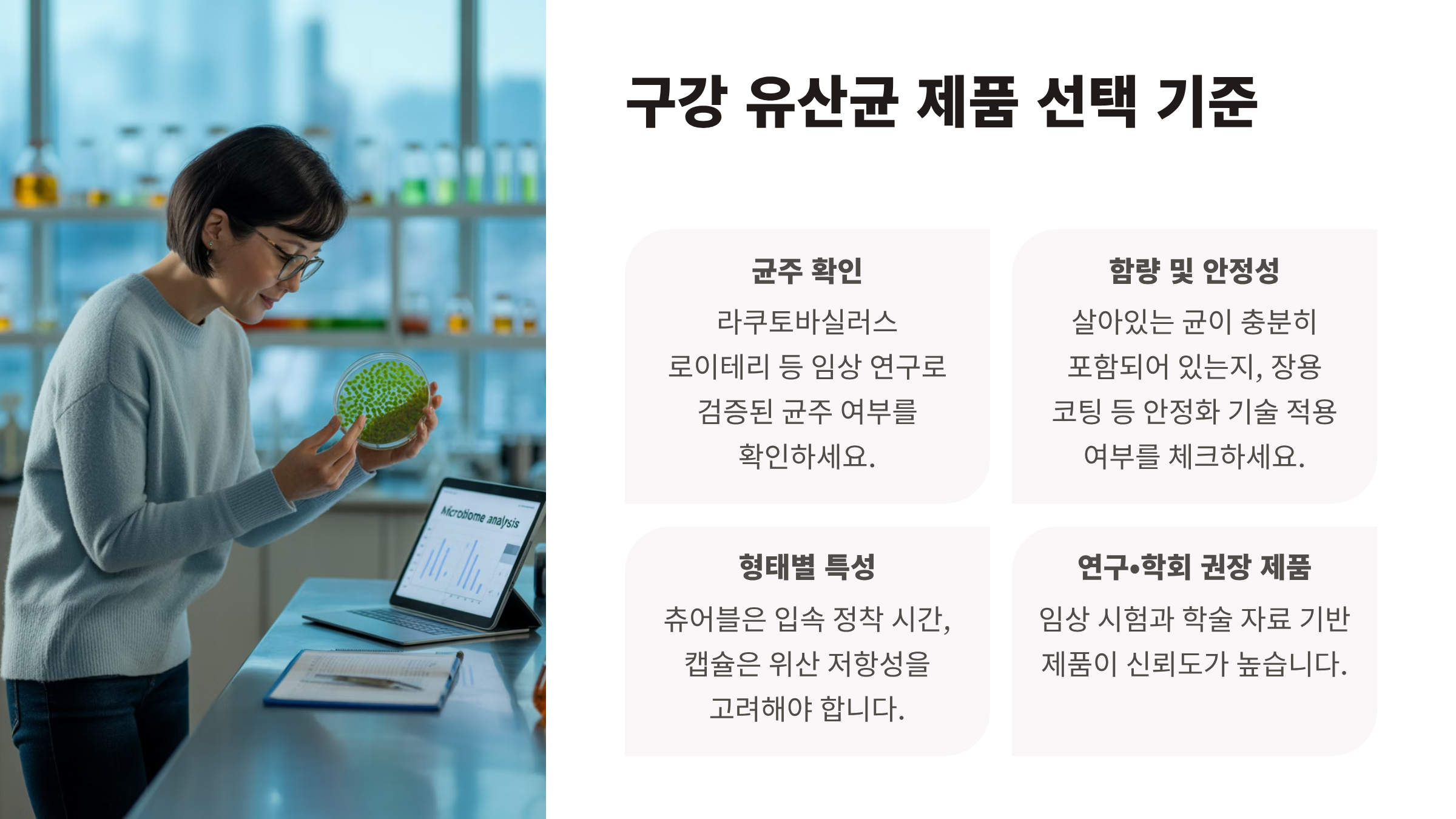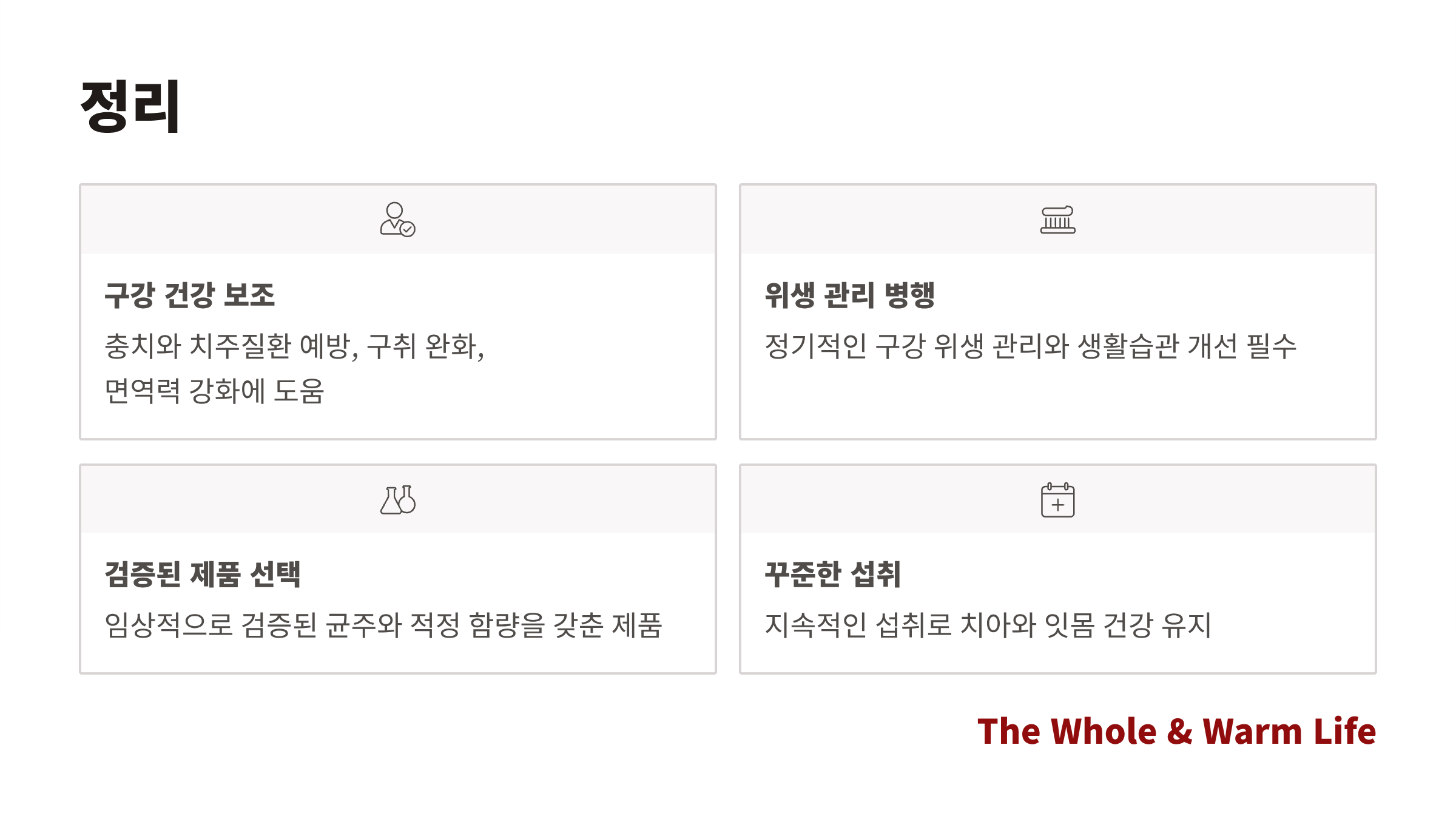 구강 유산균은 충치와 치주질환 예방, 구취 완화, 면역력 강화에 도움을 주는 구강 건강 보조 수단입니다. 그러나 정기적인 구강 위생 관리와 생활습관 개선이 병행되어야 효과가 극대화됩니다. 임상적으로 검증된 균주와 적정 함량을 갖춘 제품을 선택해 꾸준히 섭취하면 치아와 잇몸 건강을 지키는 든든한 파트너가 될 수 있습니다.