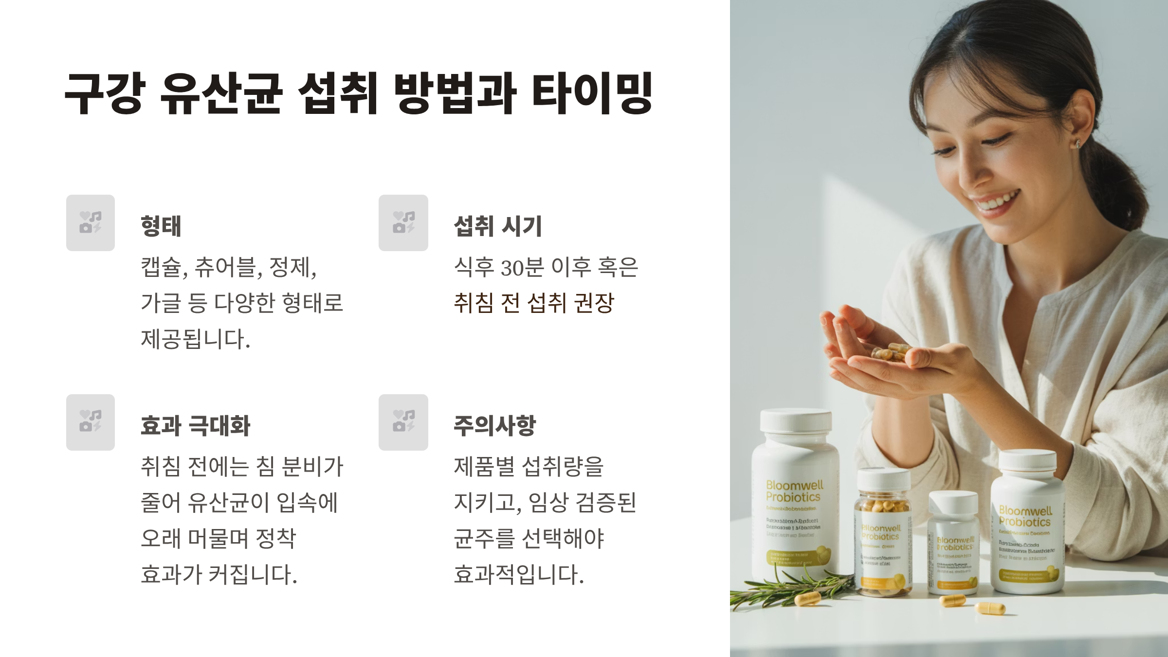 - 이유: 취침 전에는 침 분비가 줄어 유산균이 입속에 오래 머물며 정착 효과가 커짐