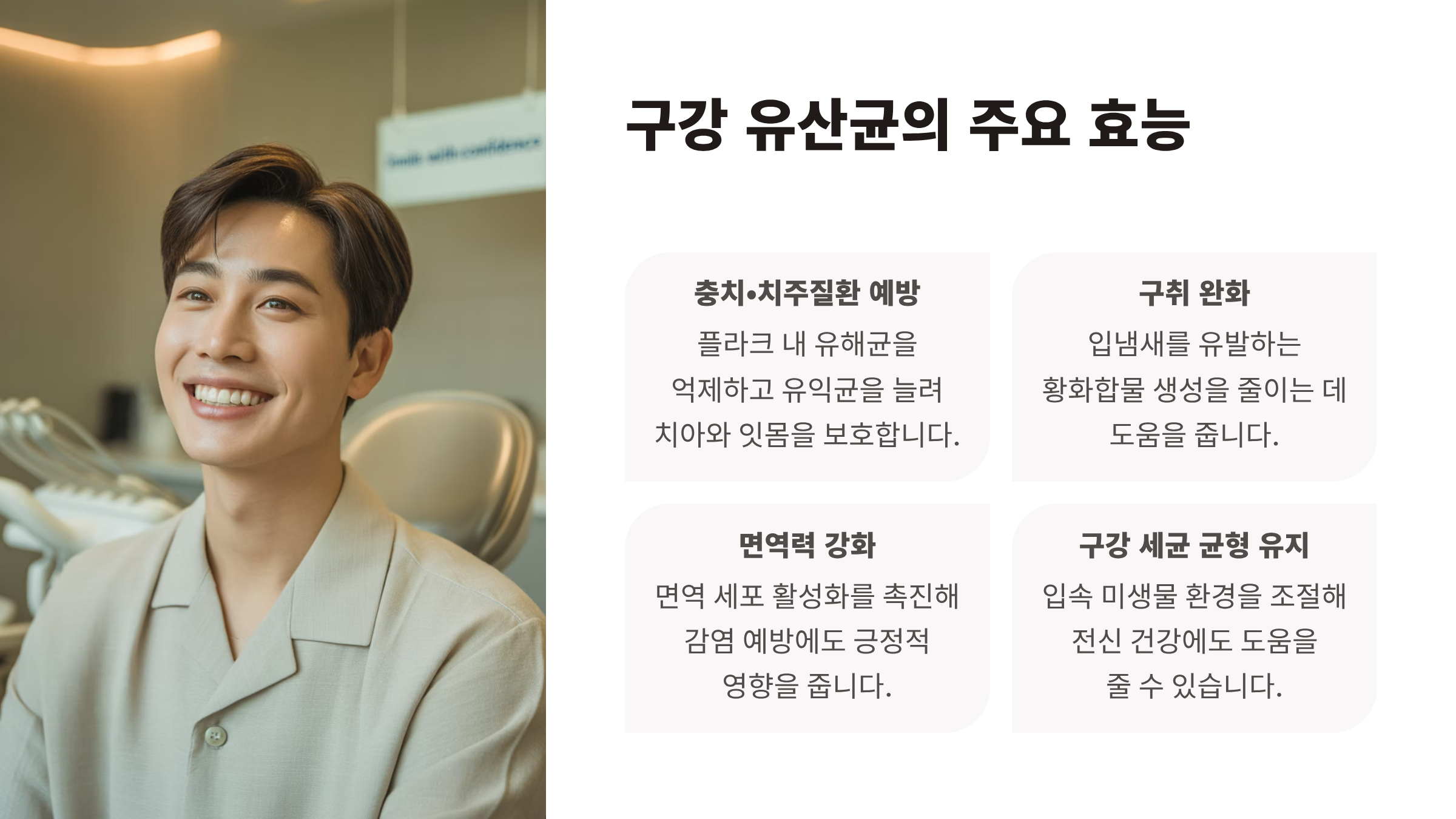 면역 세포 활성화를 촉진해 감염 예방에도 긍정적 영향을 줍니다. - 구강 세균 균형 유지