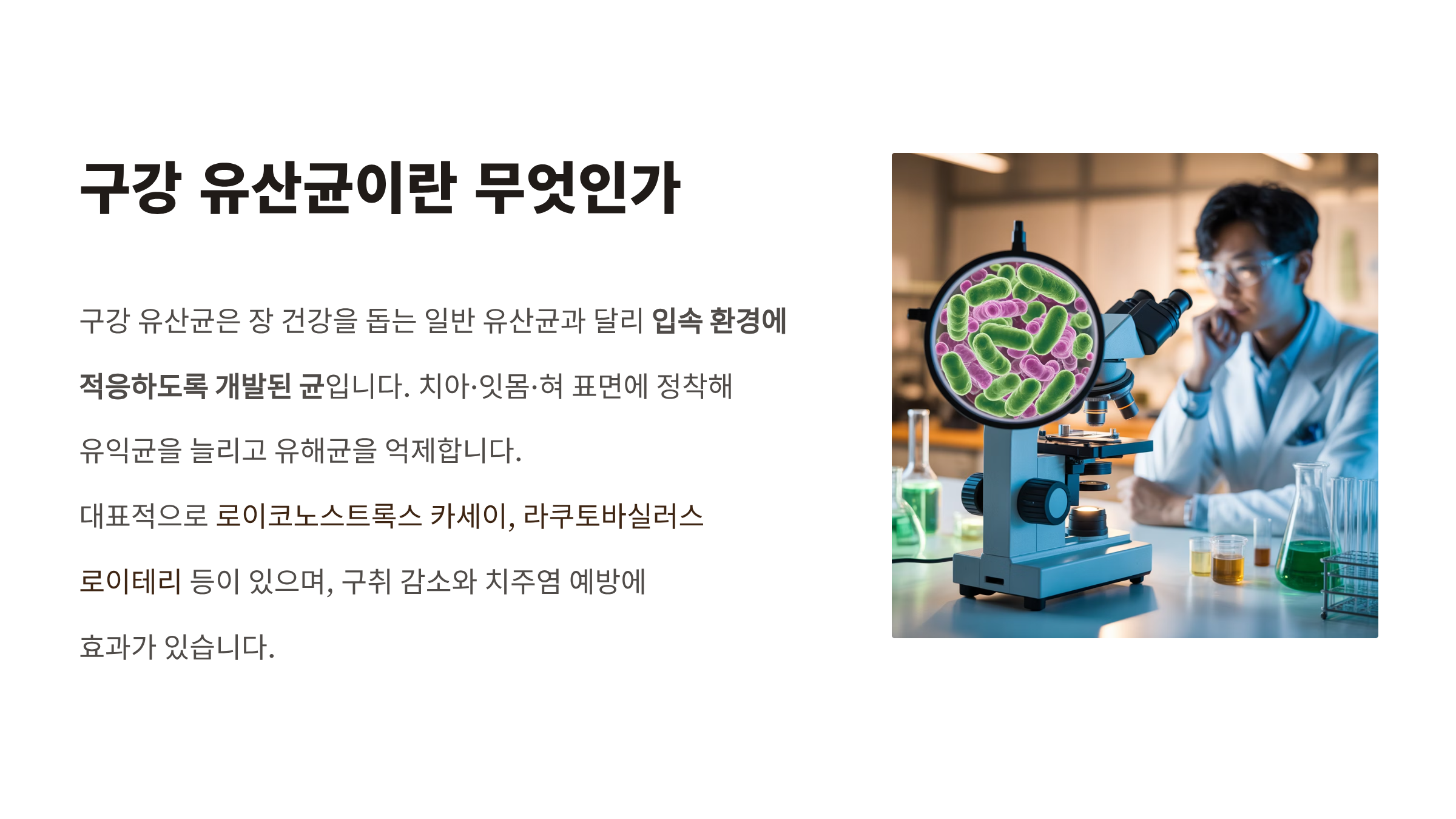 구강 유산균은 장 건강을 돕는 일반 유산균과 달리 입속 환경에 적응하도록 개발된 균입니다. 치아·잇몸·혀 표면에 정착해 유익균을 늘리고 유해균을 억제하는 역할을 합니다. 대표적으로 로이코노스트록스 카세이, 라쿠토바실러스 로이테리 등이 있으며, 구취 감소와 치주염 예방에 효과가 있다는 연구 결과가 보고되었습니다.