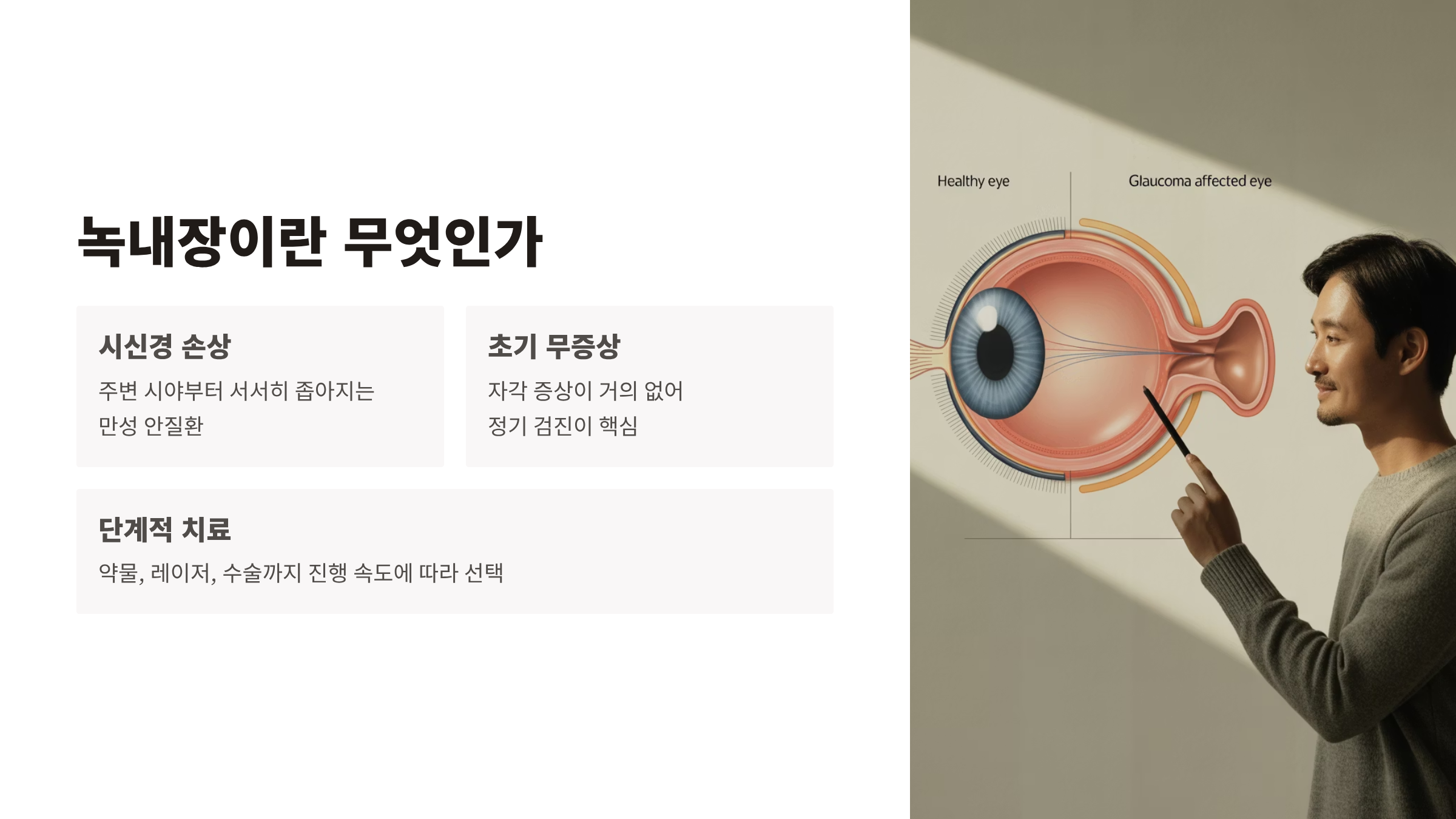 녹내장은 시신경 손상으로 주변 시야부터 서서히 좁아지는 만성 안질환입니다.