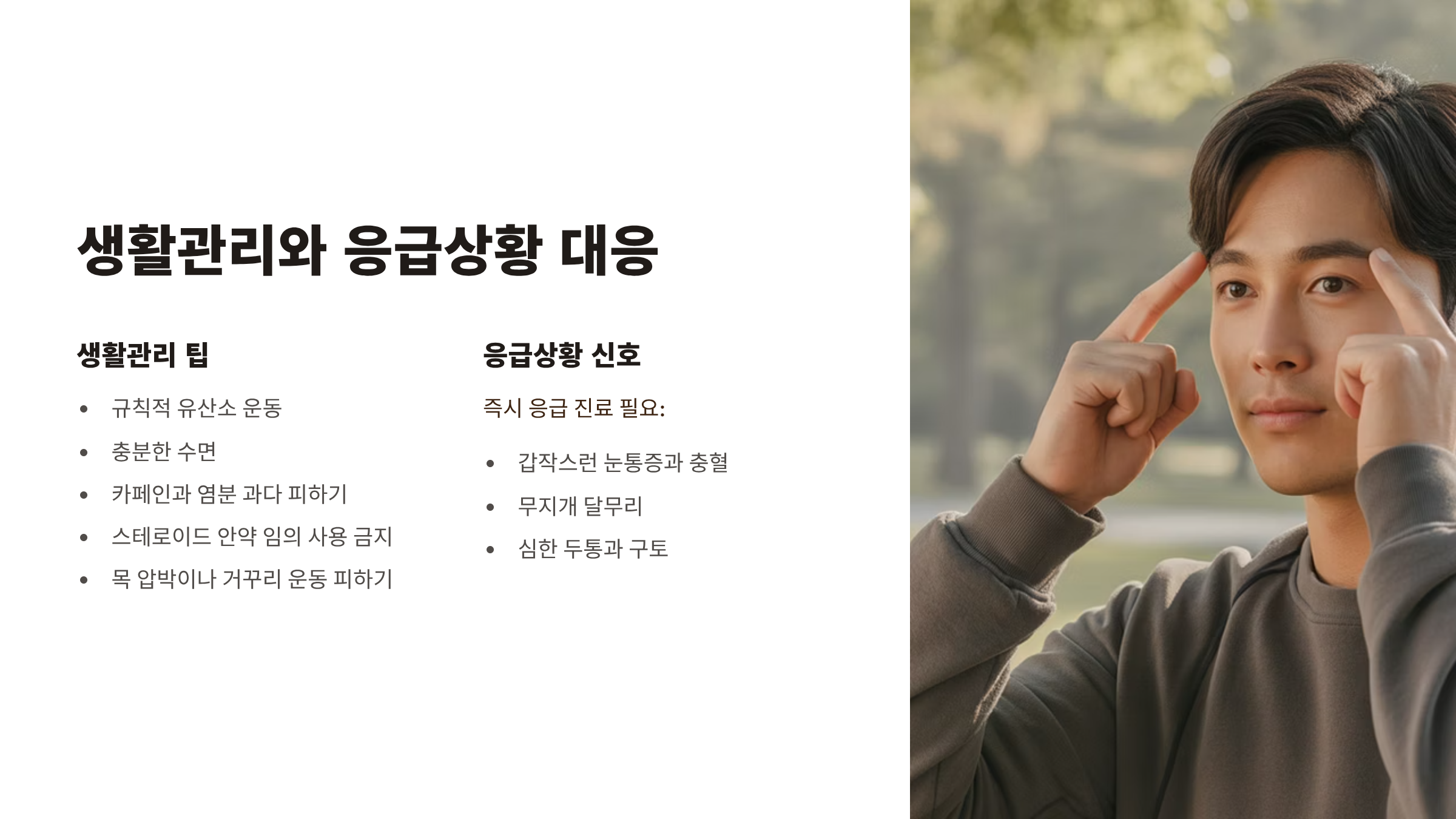 착용이나 거꾸리 운동처럼 급격한 안압 변동을 유발할 수 있는 습관은 피하세요.