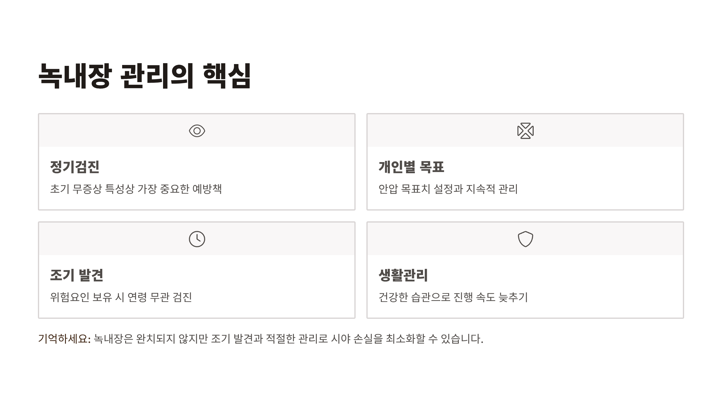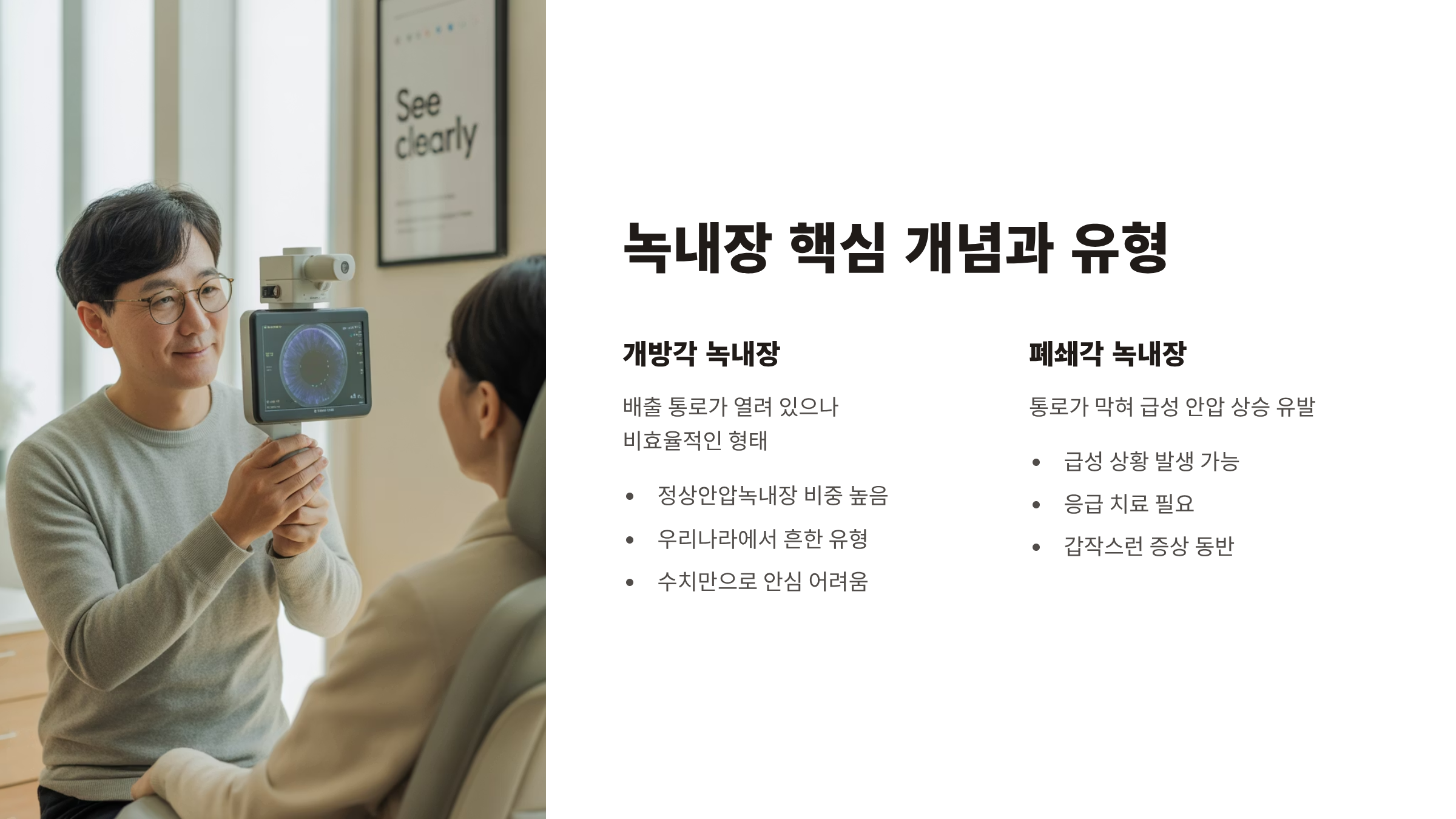 녹내장은 안구 내 체액 배출 불균형이나 시신경 취약성으로 발생해 시야 결손을 남깁니다.