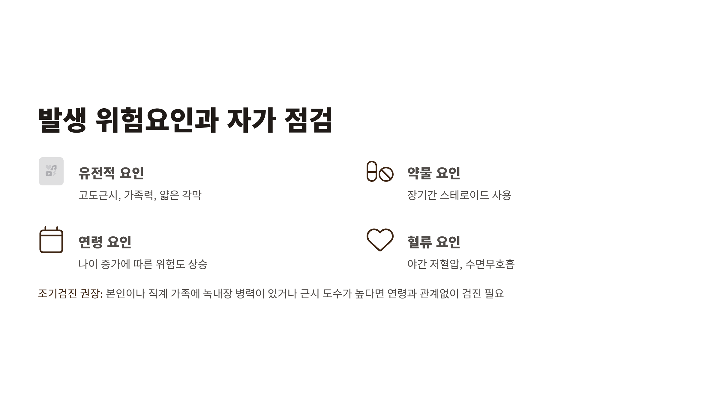 고도근시와 가족력, 얇은 각막, 장기간 스테로이드 사용, 나이 증가가 대표적 위험요인입니다.