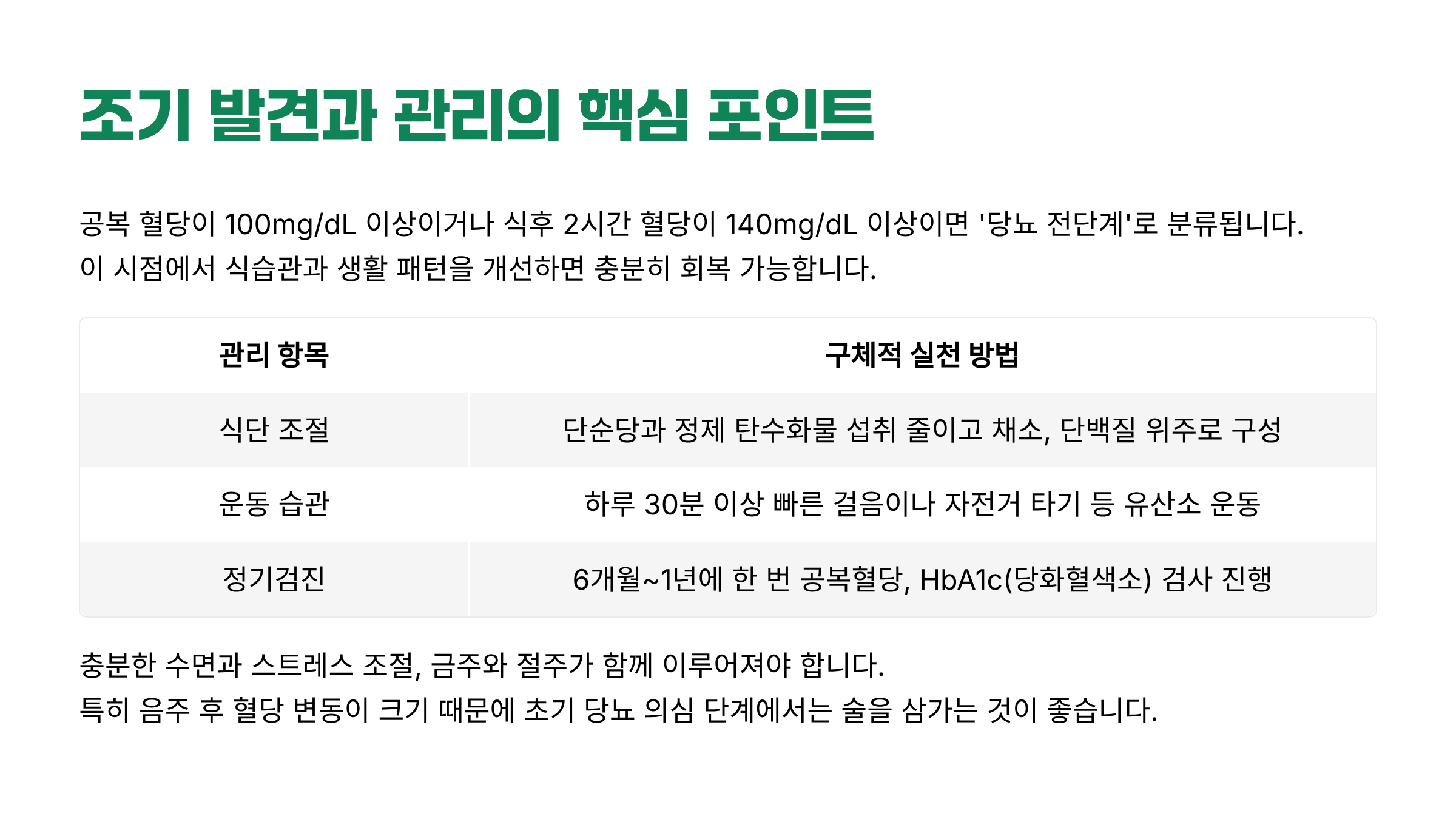 | 정기검진 | 6개월~1년에 한 번 공복혈당, HbA1c(당화혈색소) 검사 진행 |