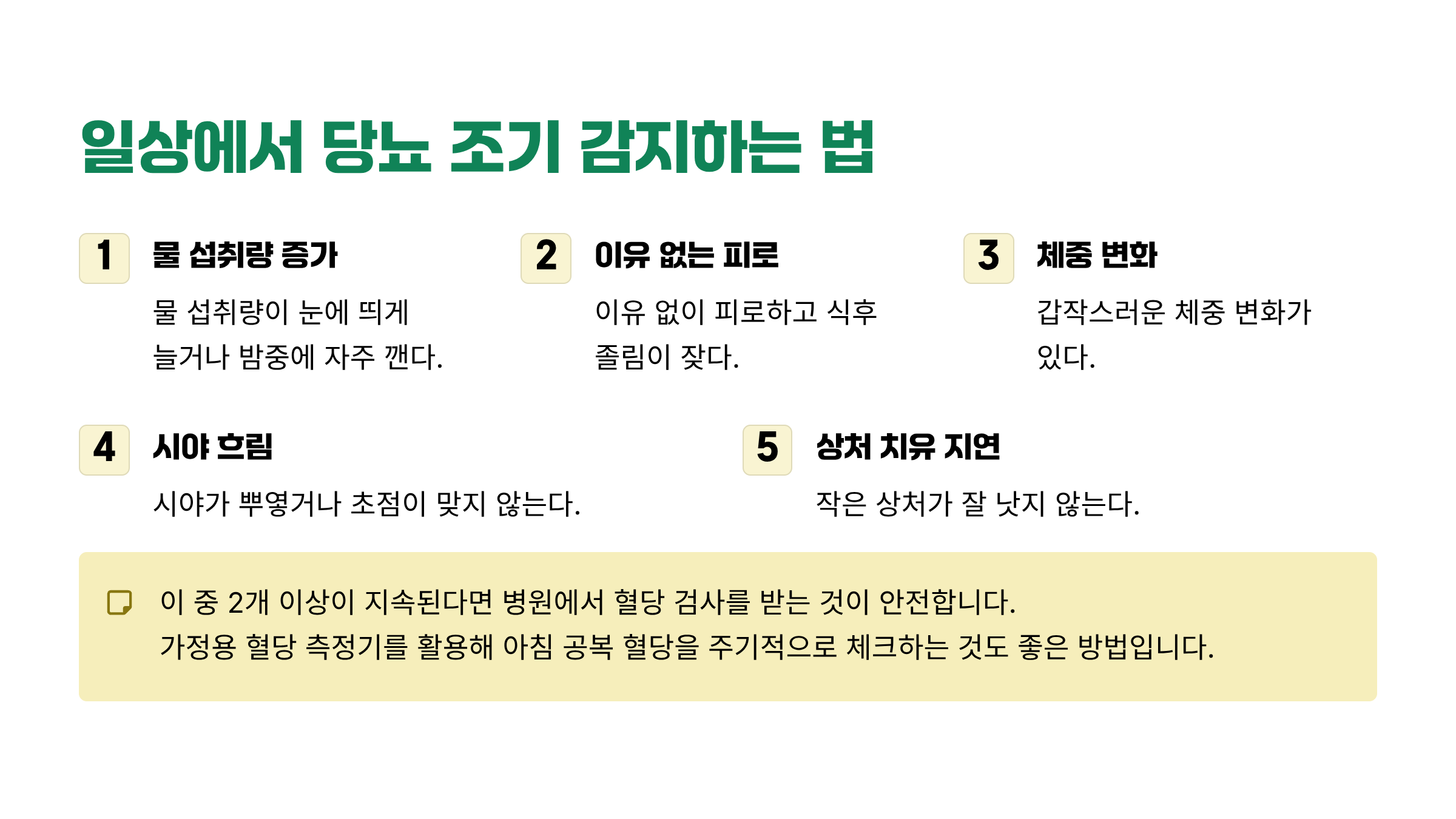 이 중 2개 이상이 지속된다면 병원에서 혈당 검사를 받는 것이 안전하다.