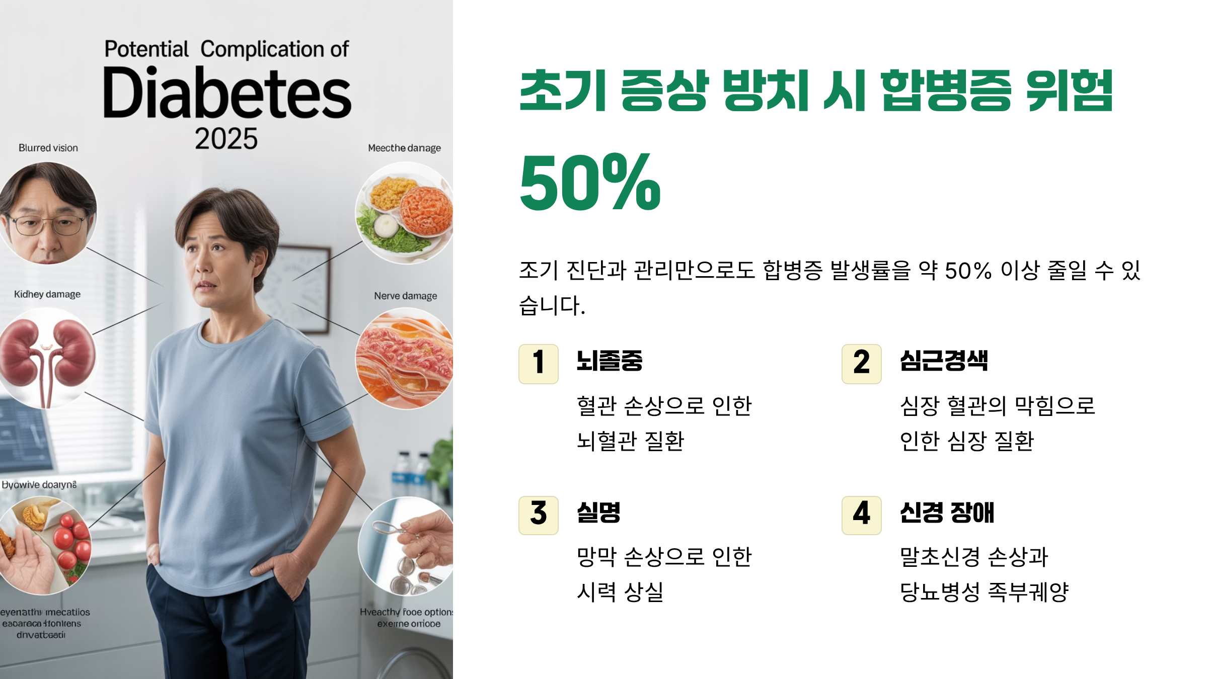 이는 뇌졸중, 심근경색, 실명, 말초신경 장애, 당뇨병성 족부궤양 등으로 이어질 수 있다.