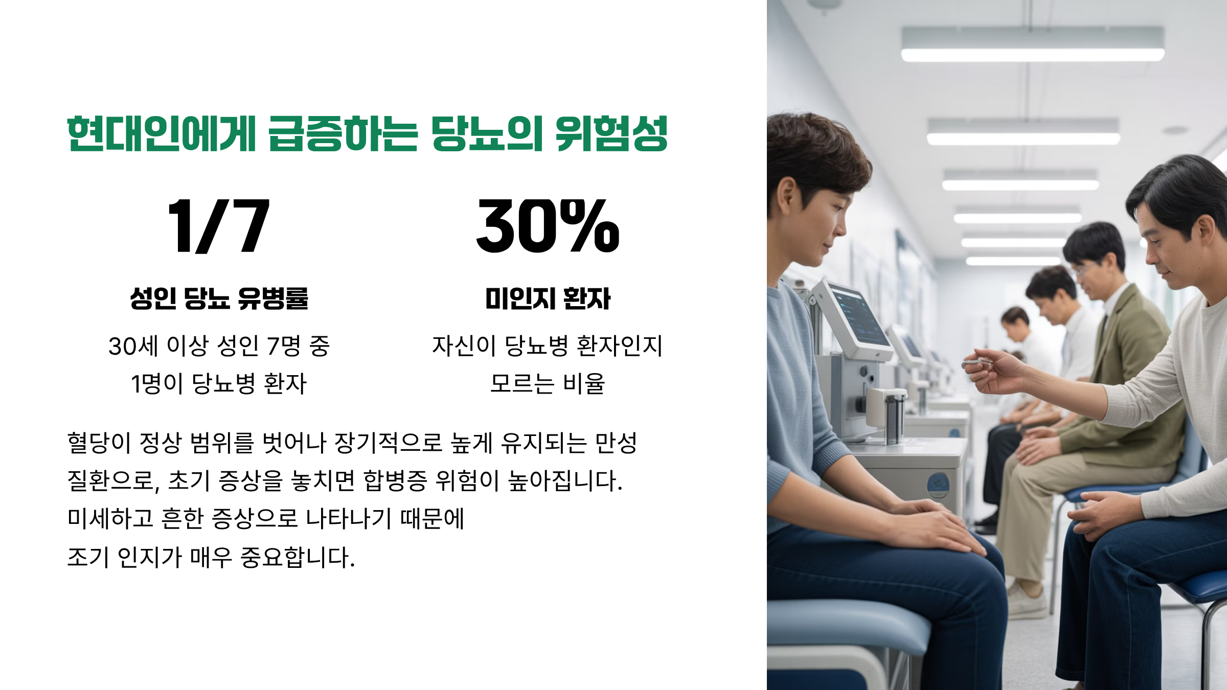 최근 국내 조사에 따르면 30세 이상 성인 7명 중 1명이 당뇨병을 앓고 있으며,