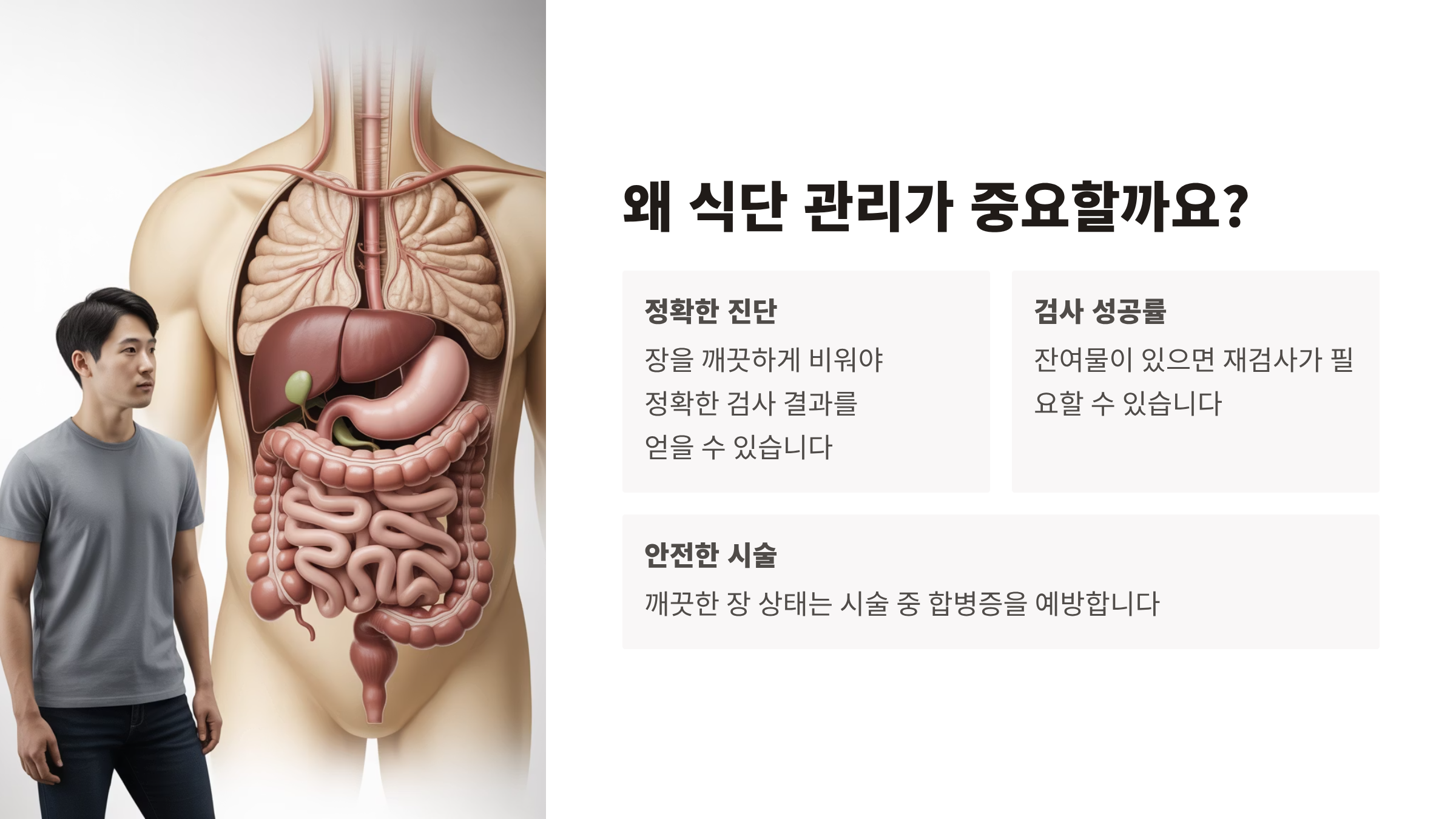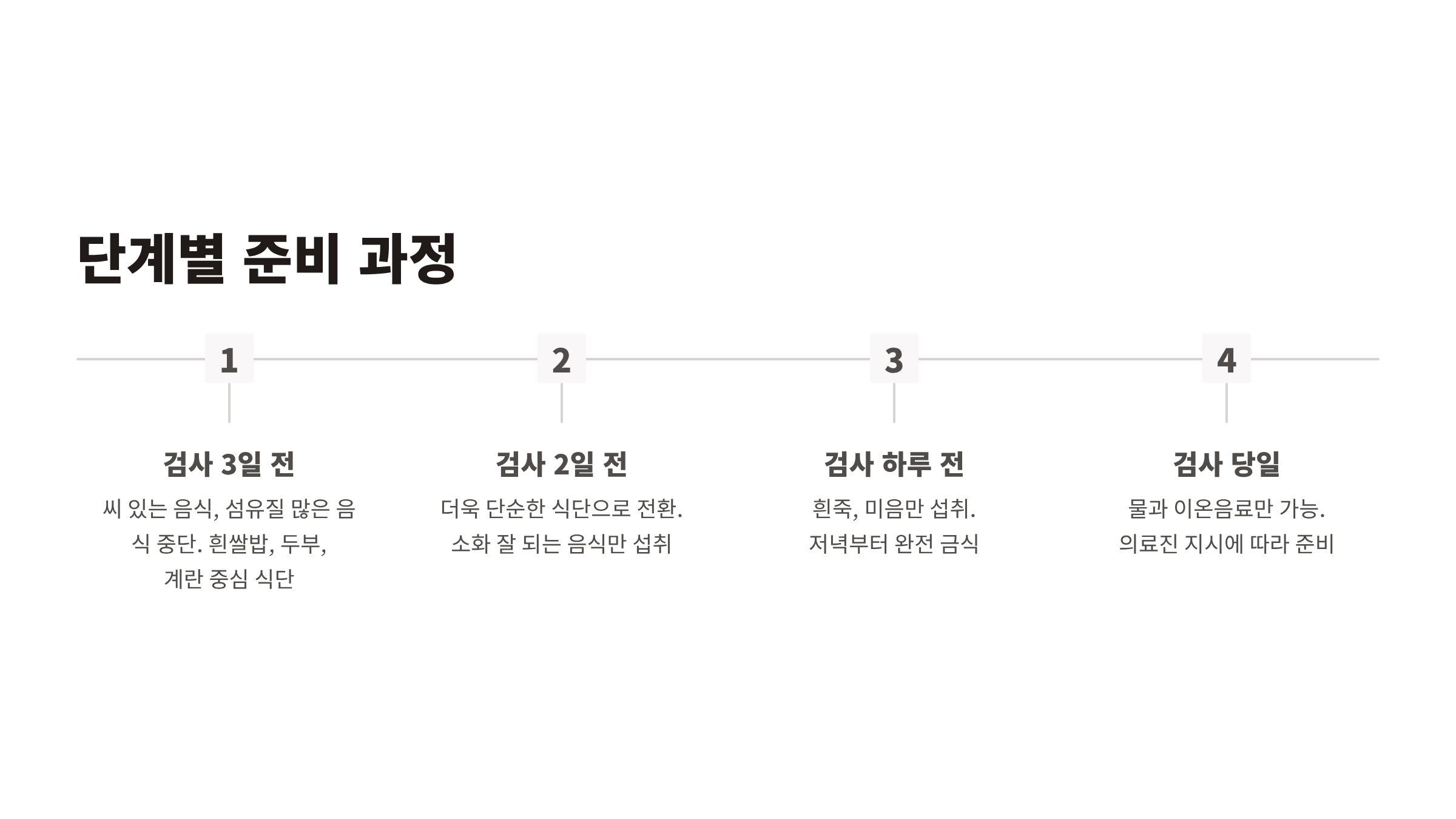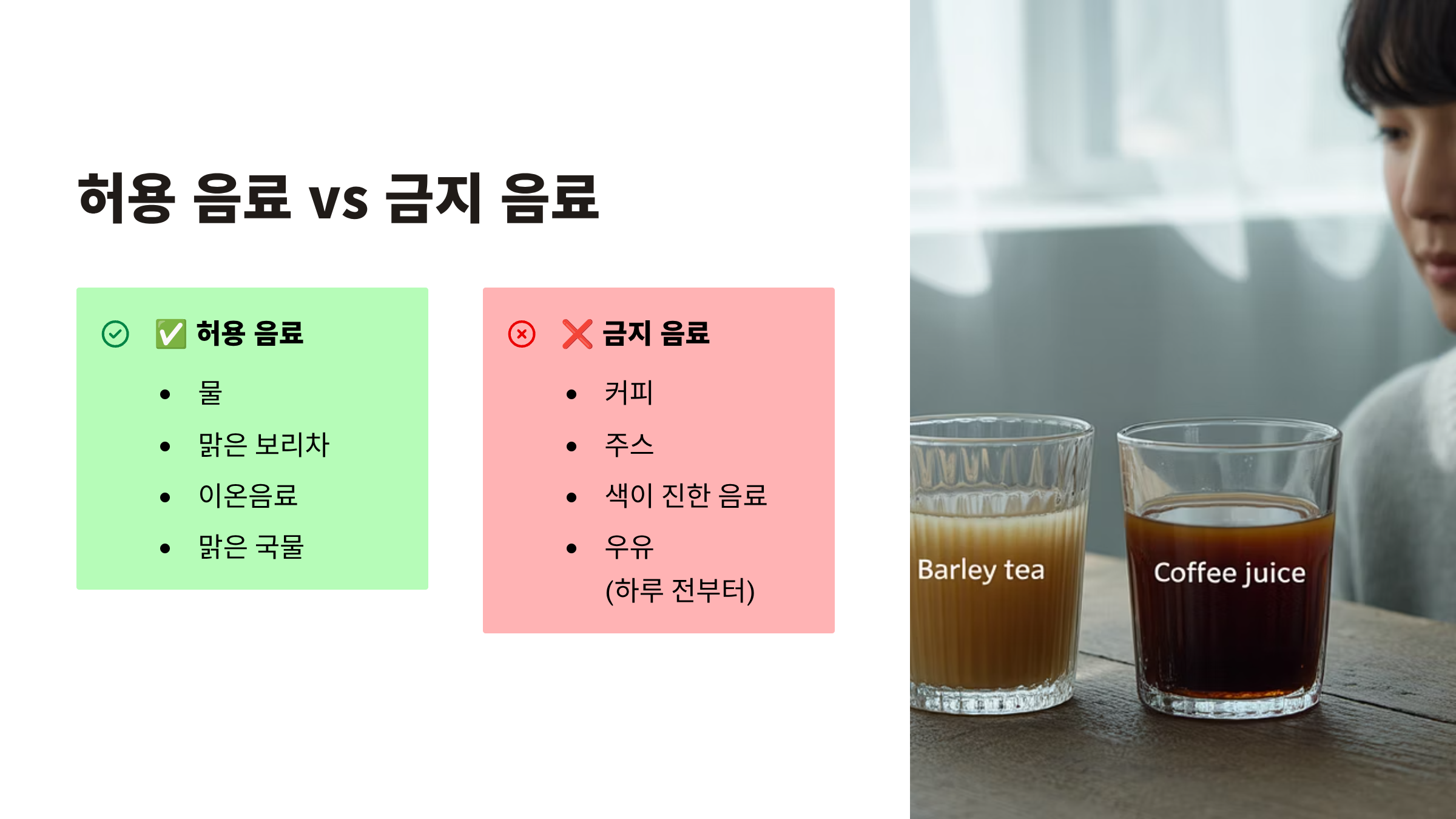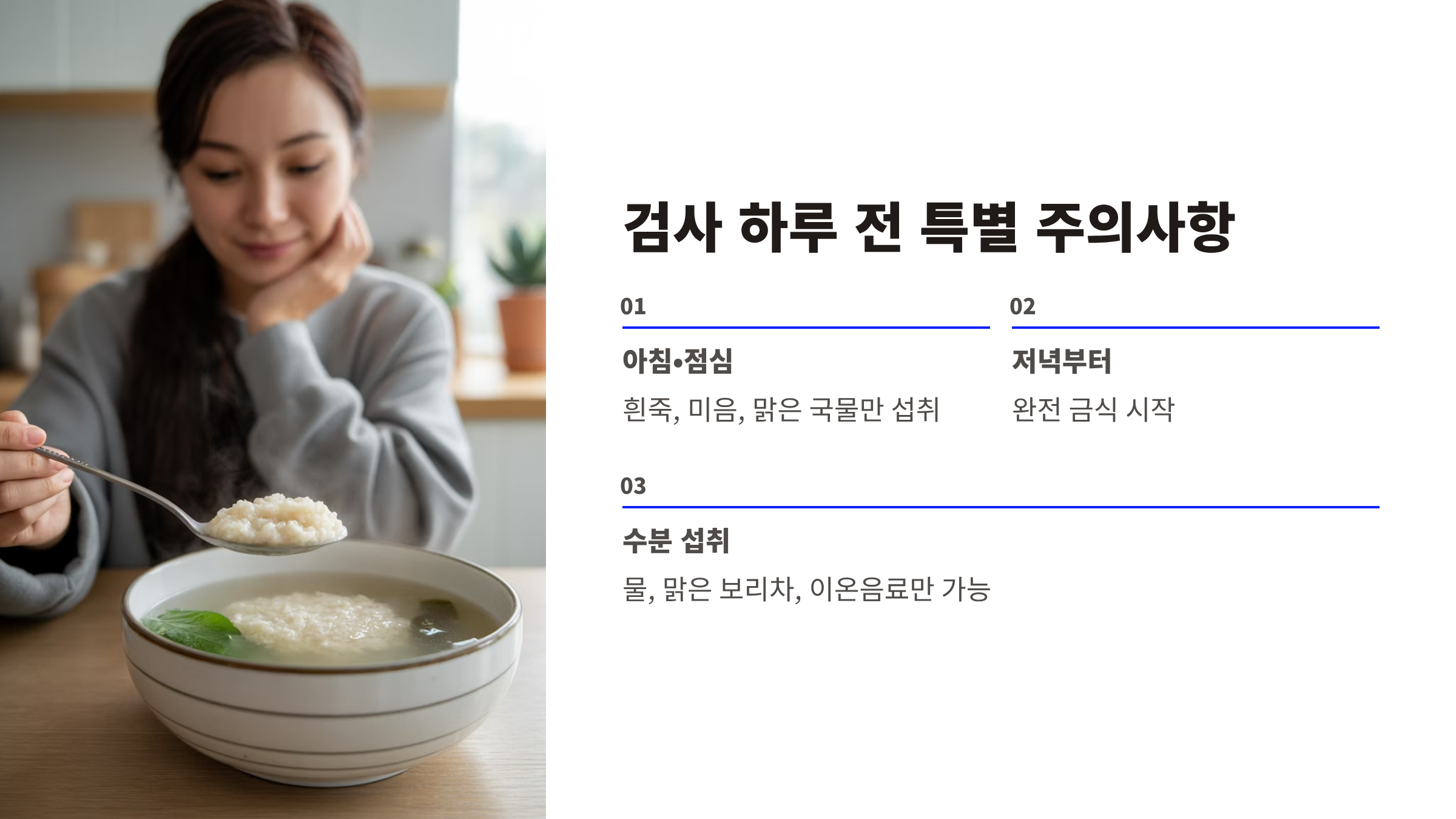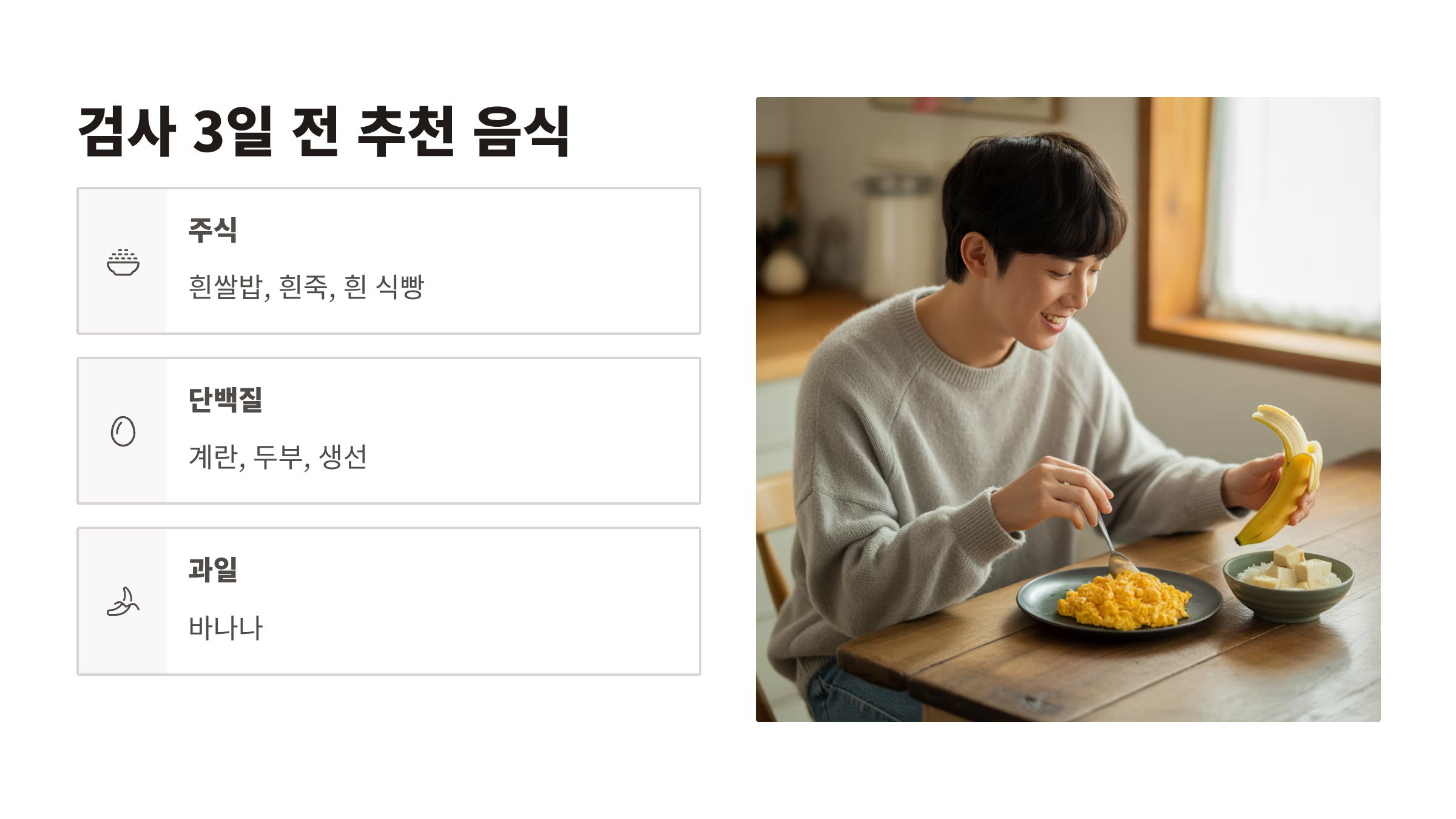 소화 잘 되는 흰죽·두부·계란 중심으로 준비하면 검사도 한결 수월해집니다.