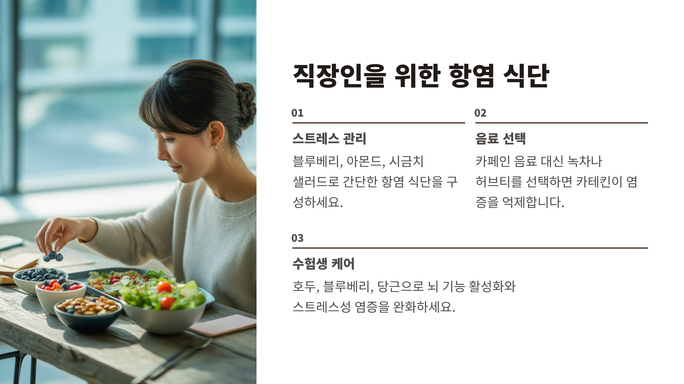 세대와 상황에 맞는 항염 식단을 실천해 보세요.