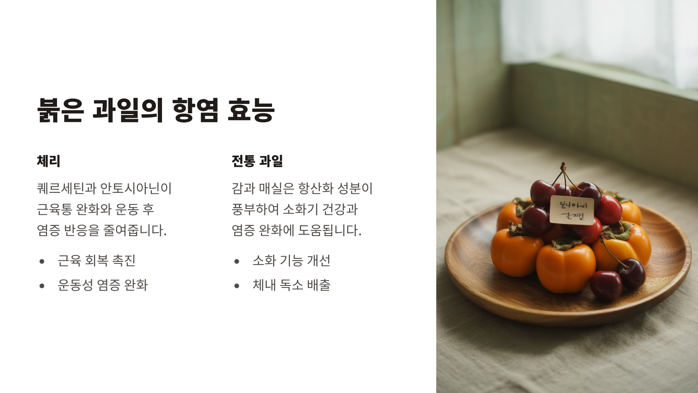 감과 매실 같은 전통 과일도 항산화 효과가 뛰어나 소화기와 면역 건강을 함께 지켜줍니다.