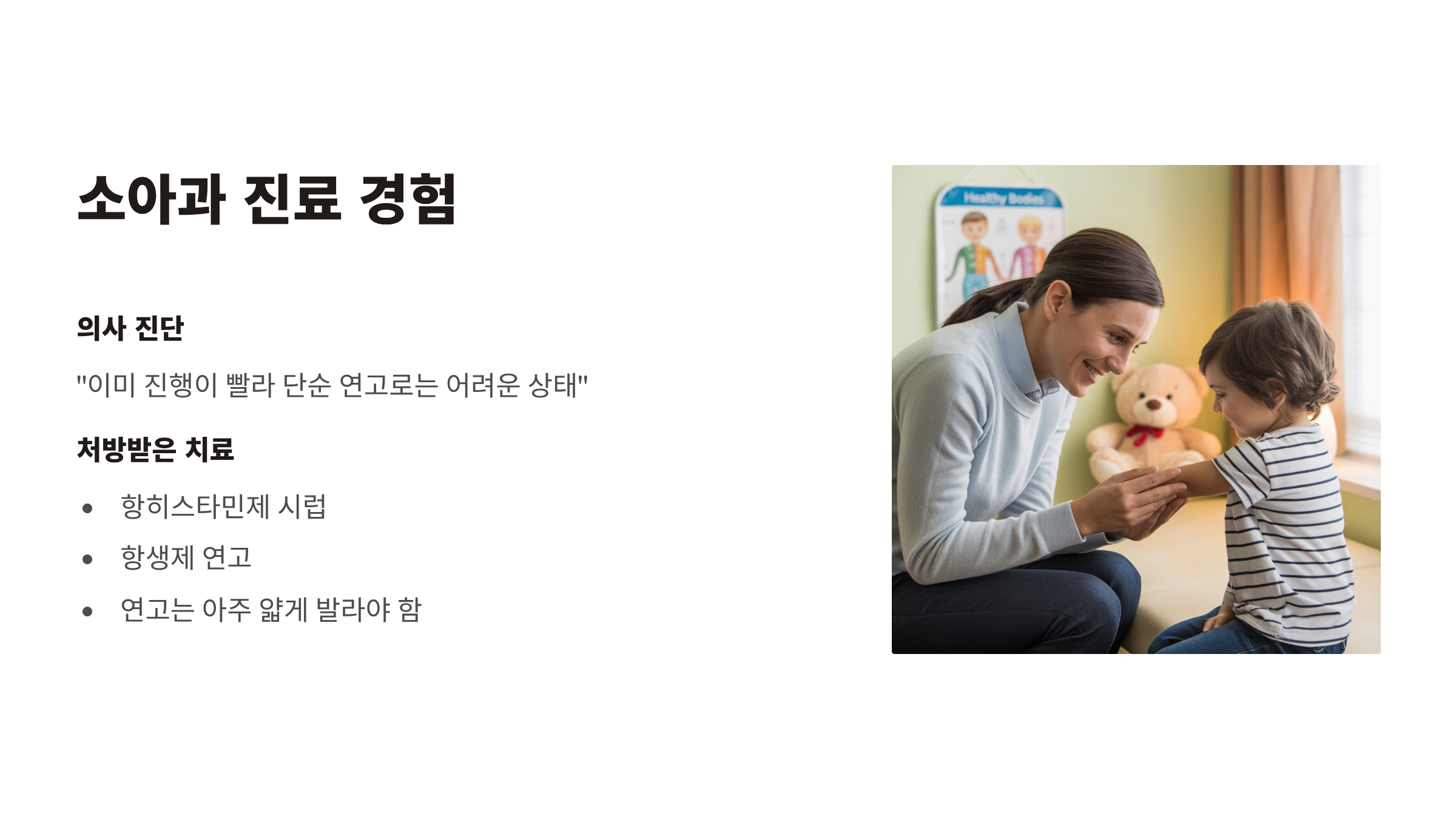 월요일 아침 소아과를 방문하니, 의사 선생님께서는 이미 진행이 빨라 단순 연고로는 어렵다고 하셨습니다. 그래서 항히스타민제 시럽과 항생제 연고를 처방받았습니다. 연고는 아주 얇게 바르는 것이 중요했고, 약을 복용한 뒤 아이는 가려움이 한결 줄었다고 했습니다.