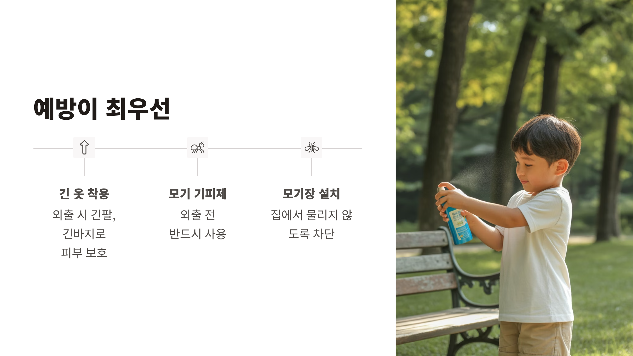 모기 알레르기는 치료보다 예방이 우선입니다. 아이에게는 긴 옷을 입히고, 외출 시 모기 기피제를 꼭 챙기고 있습니다. 집에서는 모기장을 설치하고 창틀, 환기구, 배수홀 같은 작은 틈새까지 막는 모기 차단 시공을 통해 모기 유입을 최소화했습니다. 또한, 물린 직후 냉찜질을 해주는 습관도 큰 도움이 되었습니다.