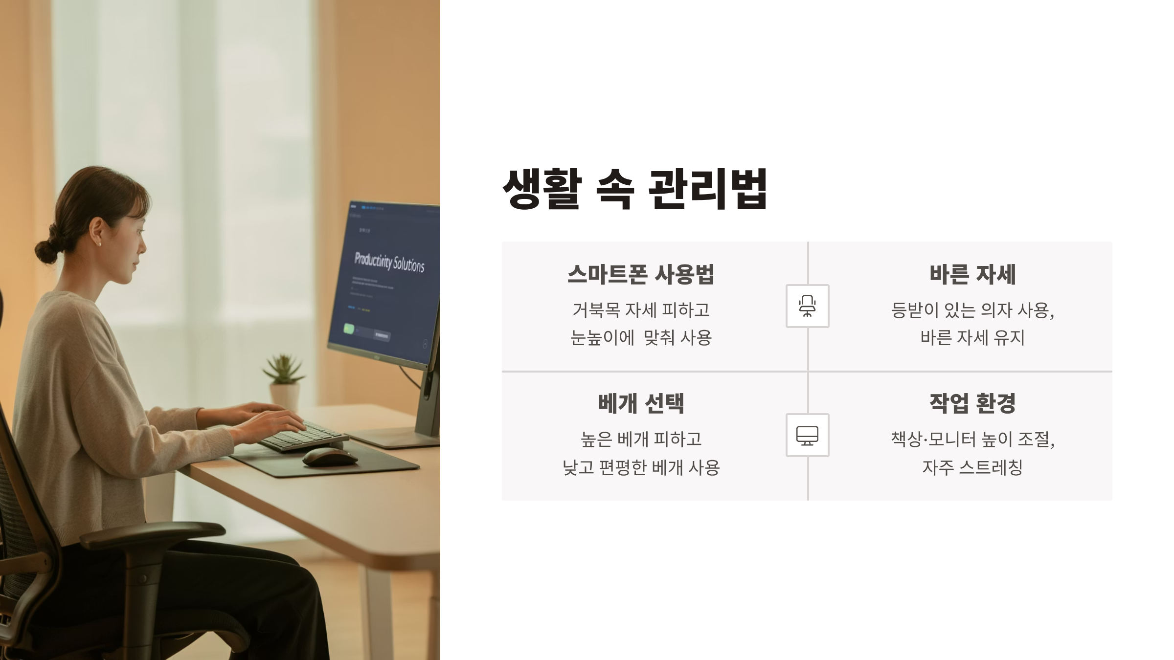 - 책상·모니터 높이 조절, 자주 스트레칭