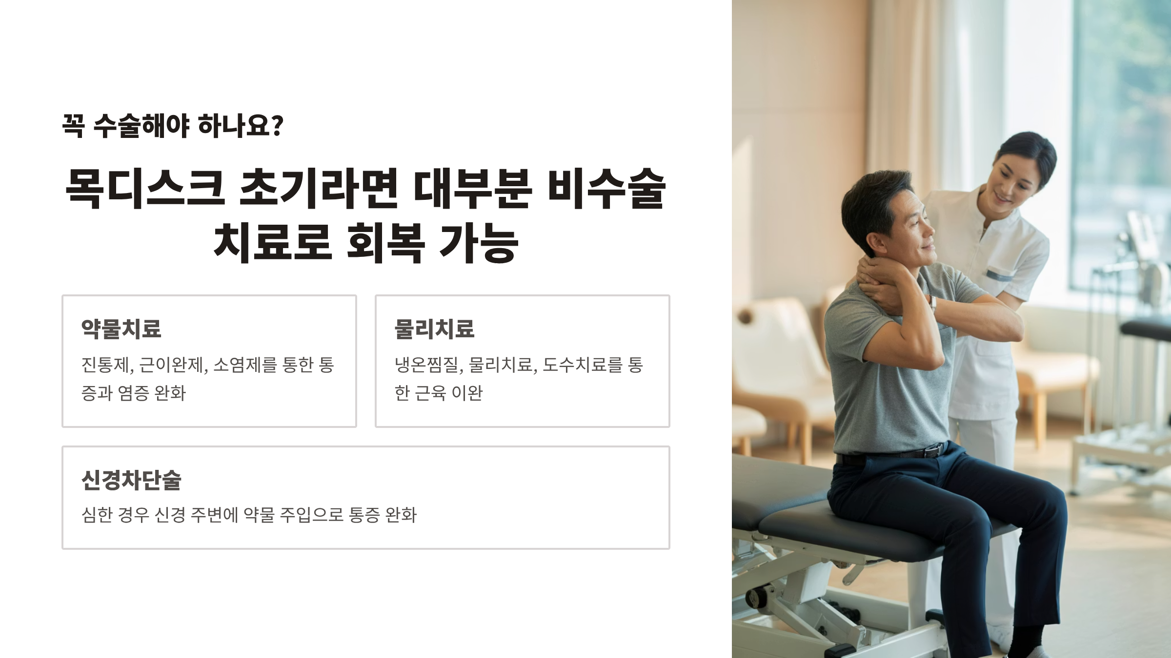 목디스크 초기라면 대부분 비수술 치료로 회복 가능합니다.