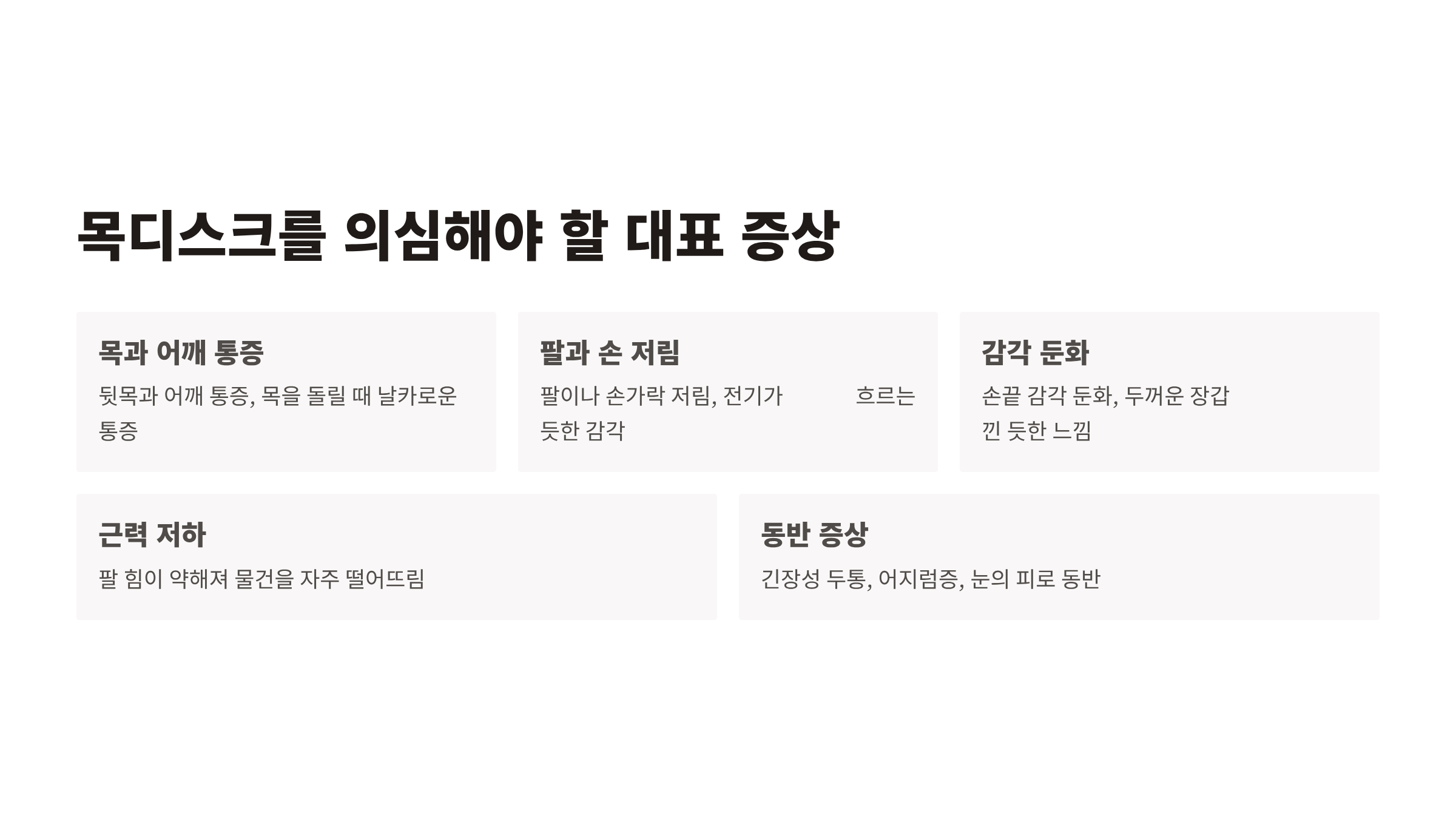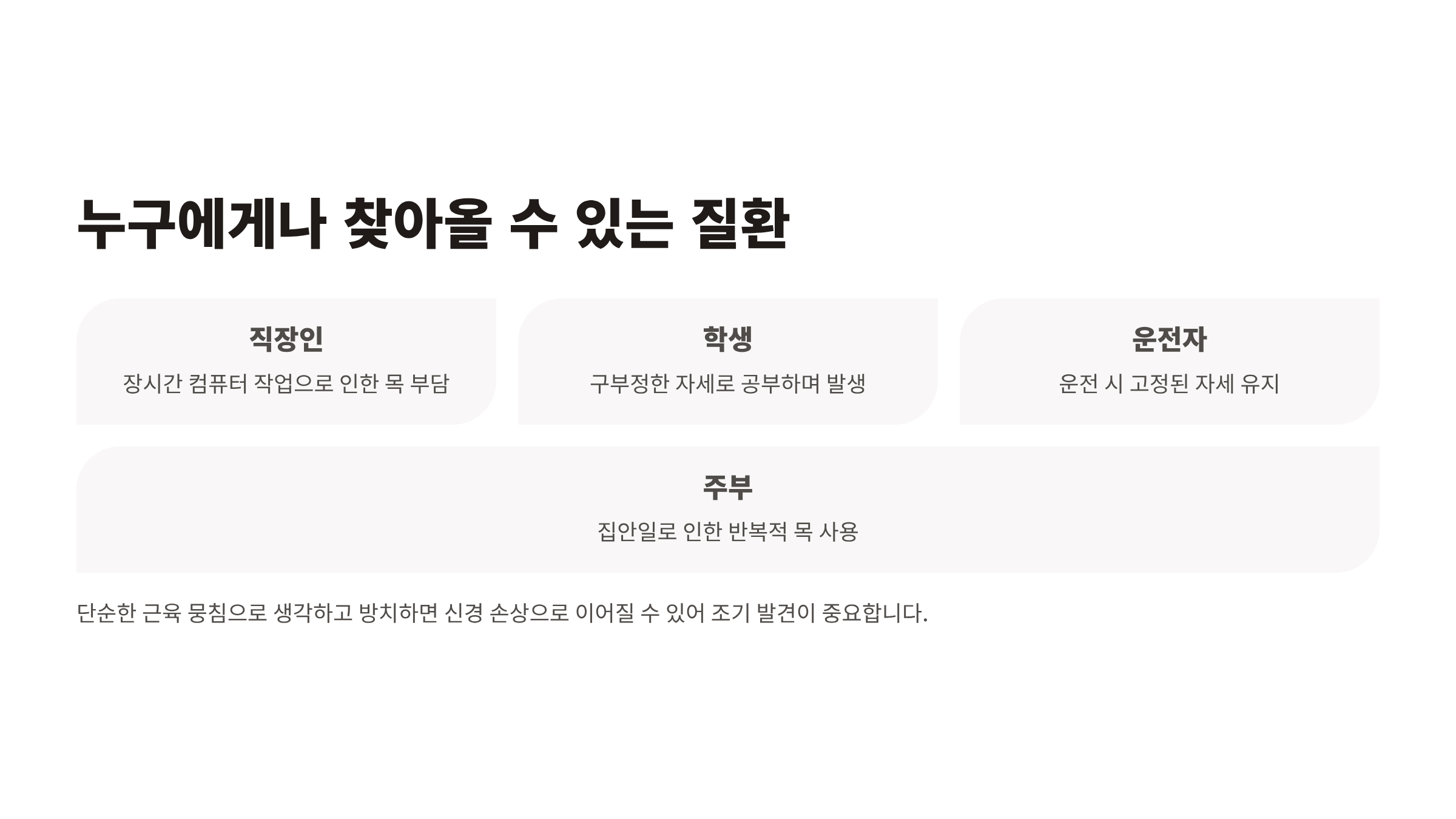 | 통증 부위 | 목 주변 근육 | 목·어깨·팔·손까지 방사 |