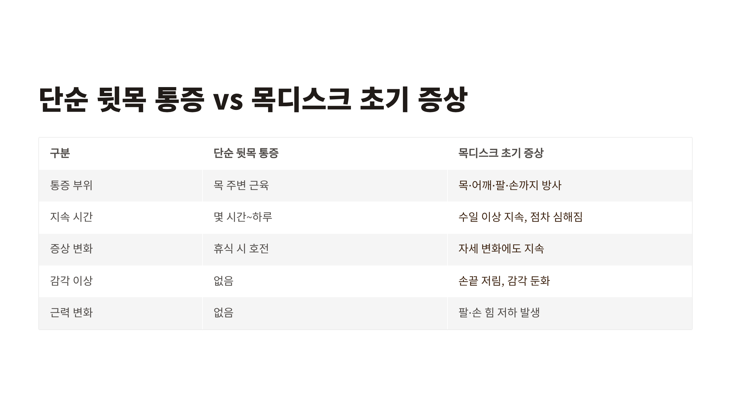 | 구분 | 단순 뒷목 통증 | 목디스크 초기증상 |