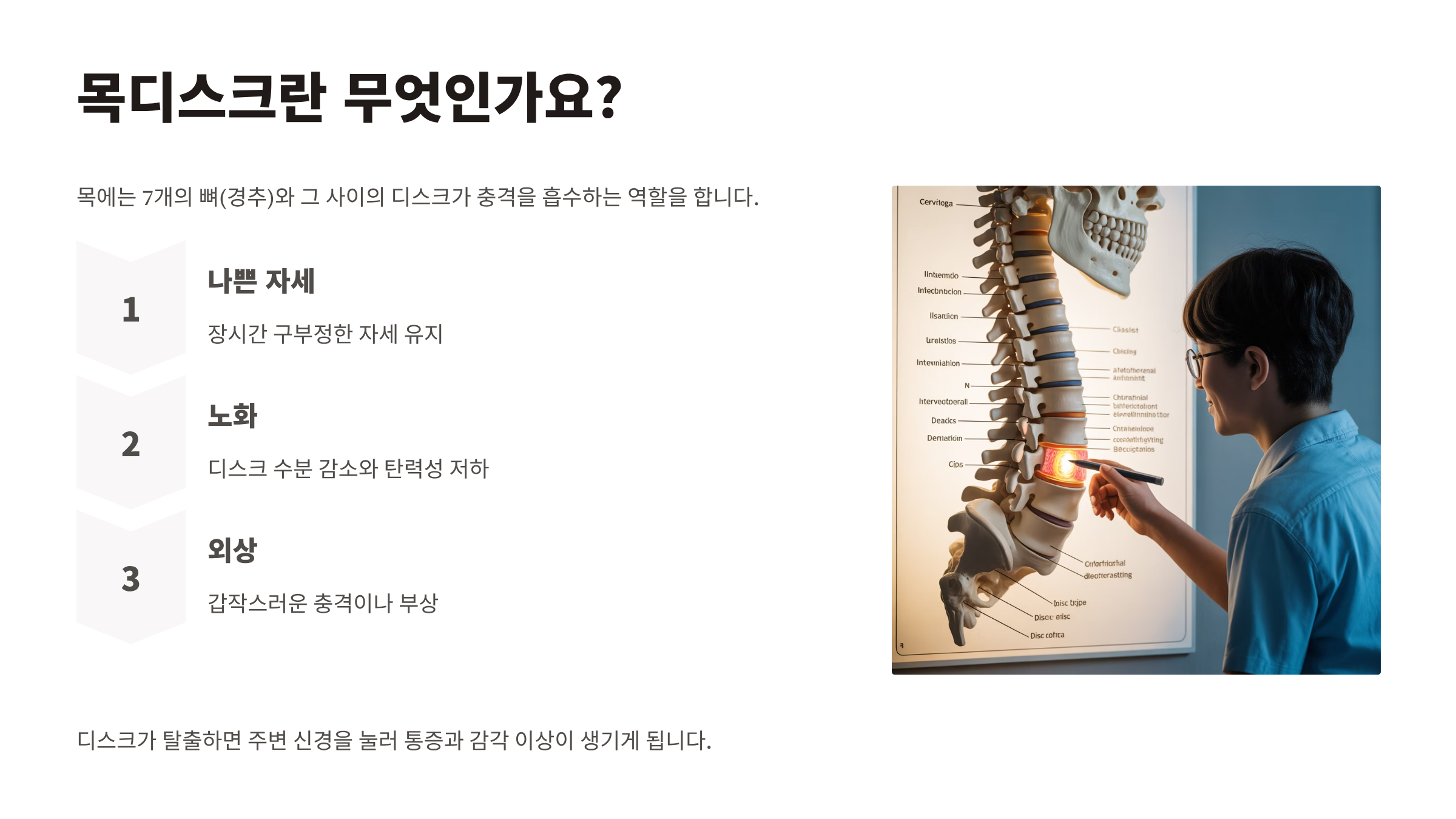 목에는 7개의 뼈(경추)와 그 사이의 디스크가 충격을 흡수하는 역할을 합니다.