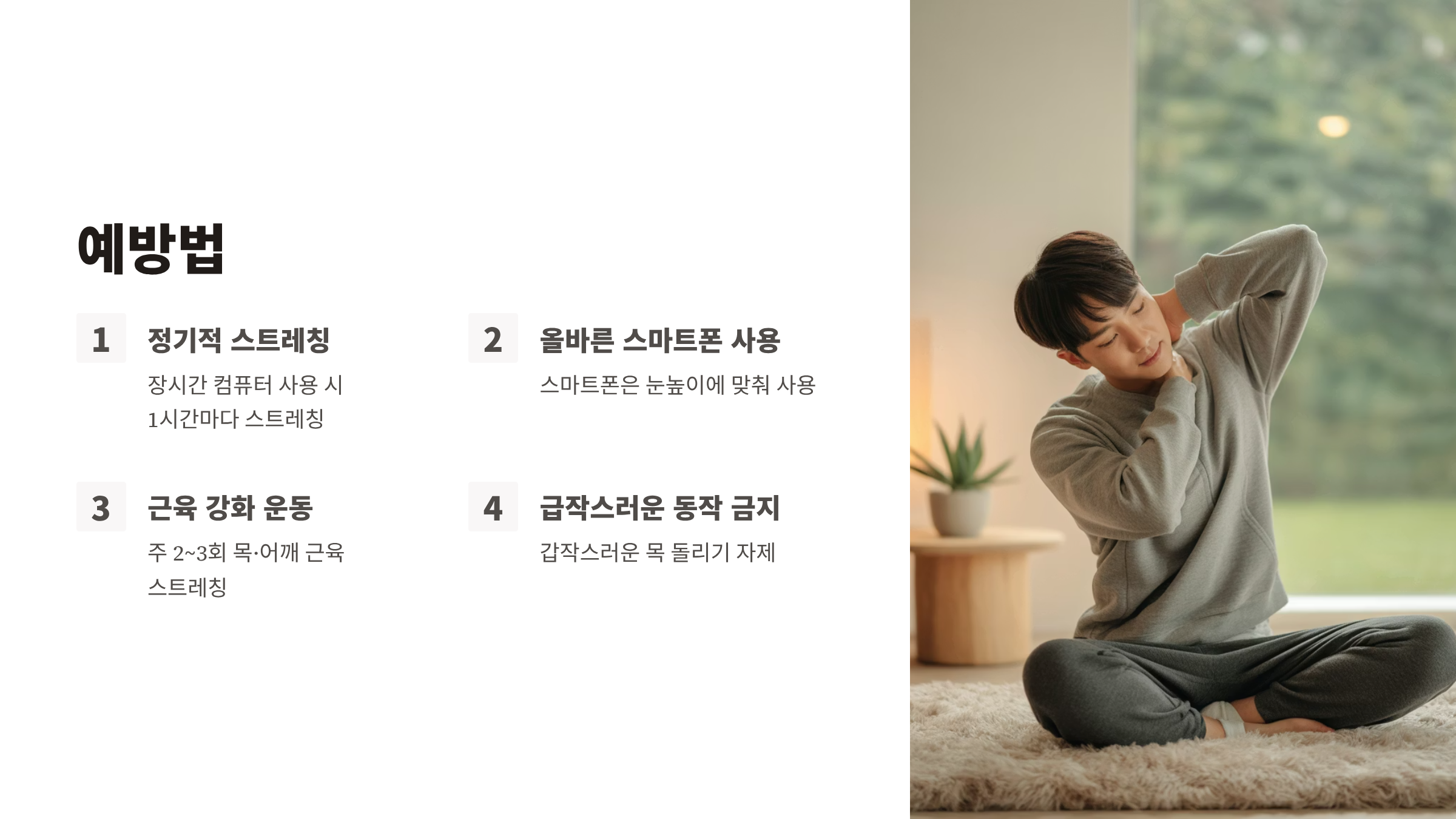 - 주 2~3회 목·어깨 근육 스트레칭