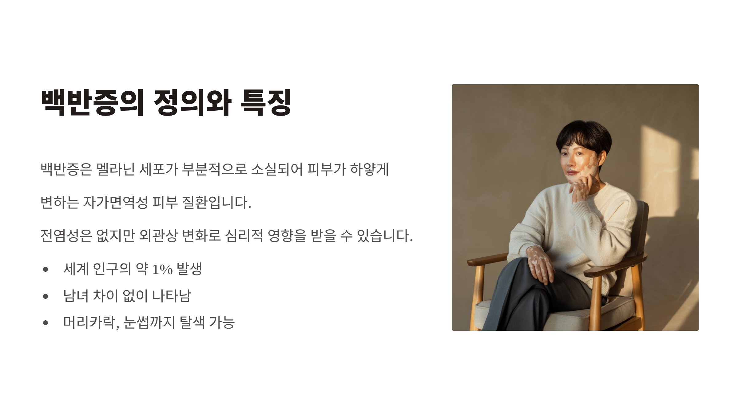 백반증은 생명에 위협을 주는 질환은 아니지만, 자신감과 삶의 질에 큰 영향을 미친다.