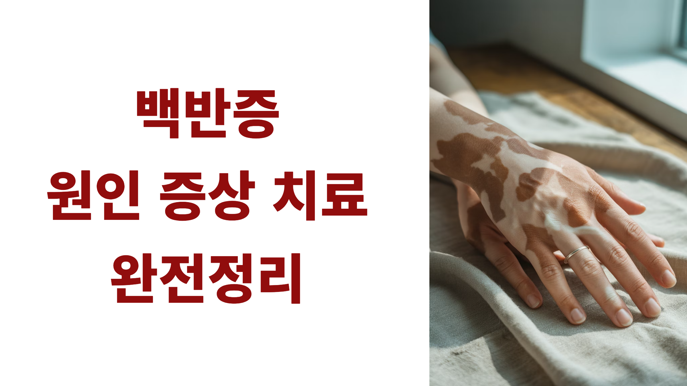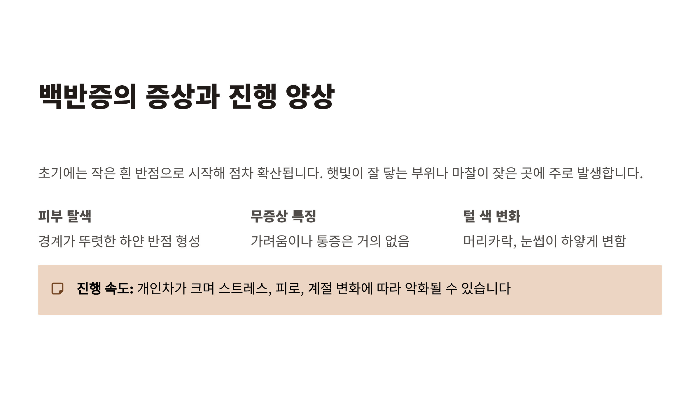 - 주요 증상: 피부 탈색, 경계 뚜렷한 흰 반점, 무통·무가려움