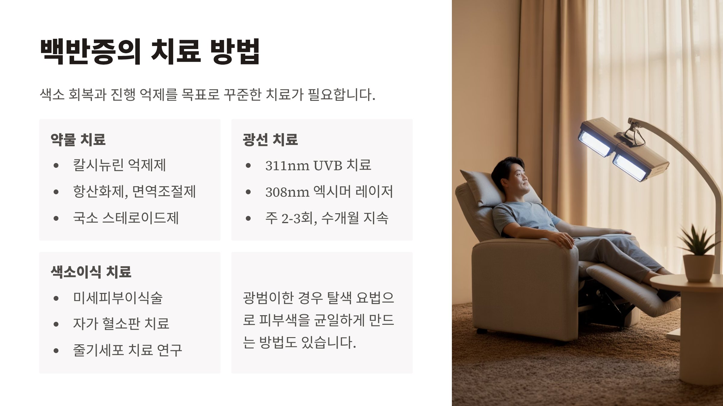 - 국소 자외선B(311nm UVB) 또는 엑시머 레이저(308nm) 치료가 대표적이다.