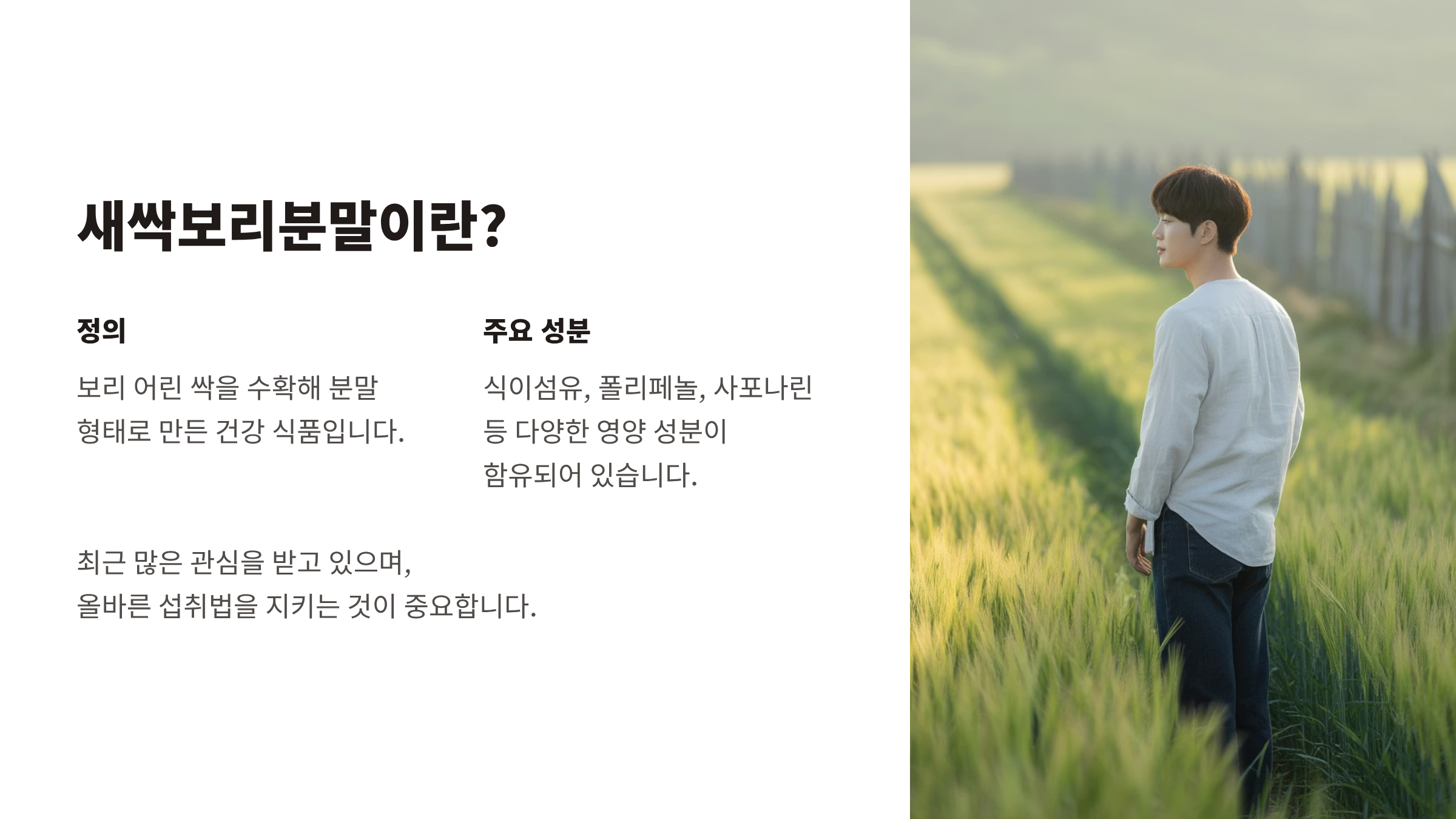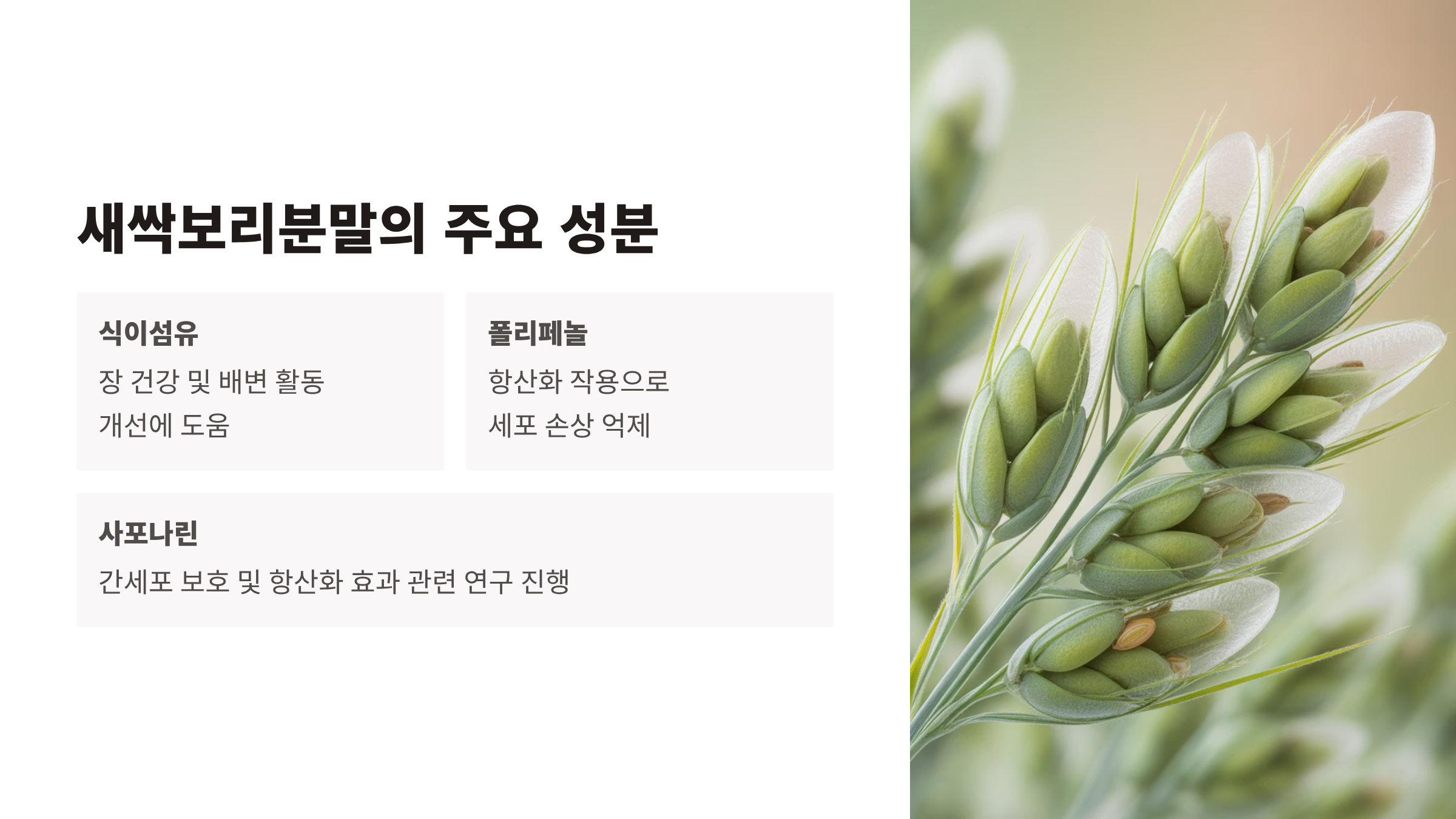 이번 글에서는 새싹보리분말의 주요 성분과 섭취 시 유의사항을 정리해드립니다.