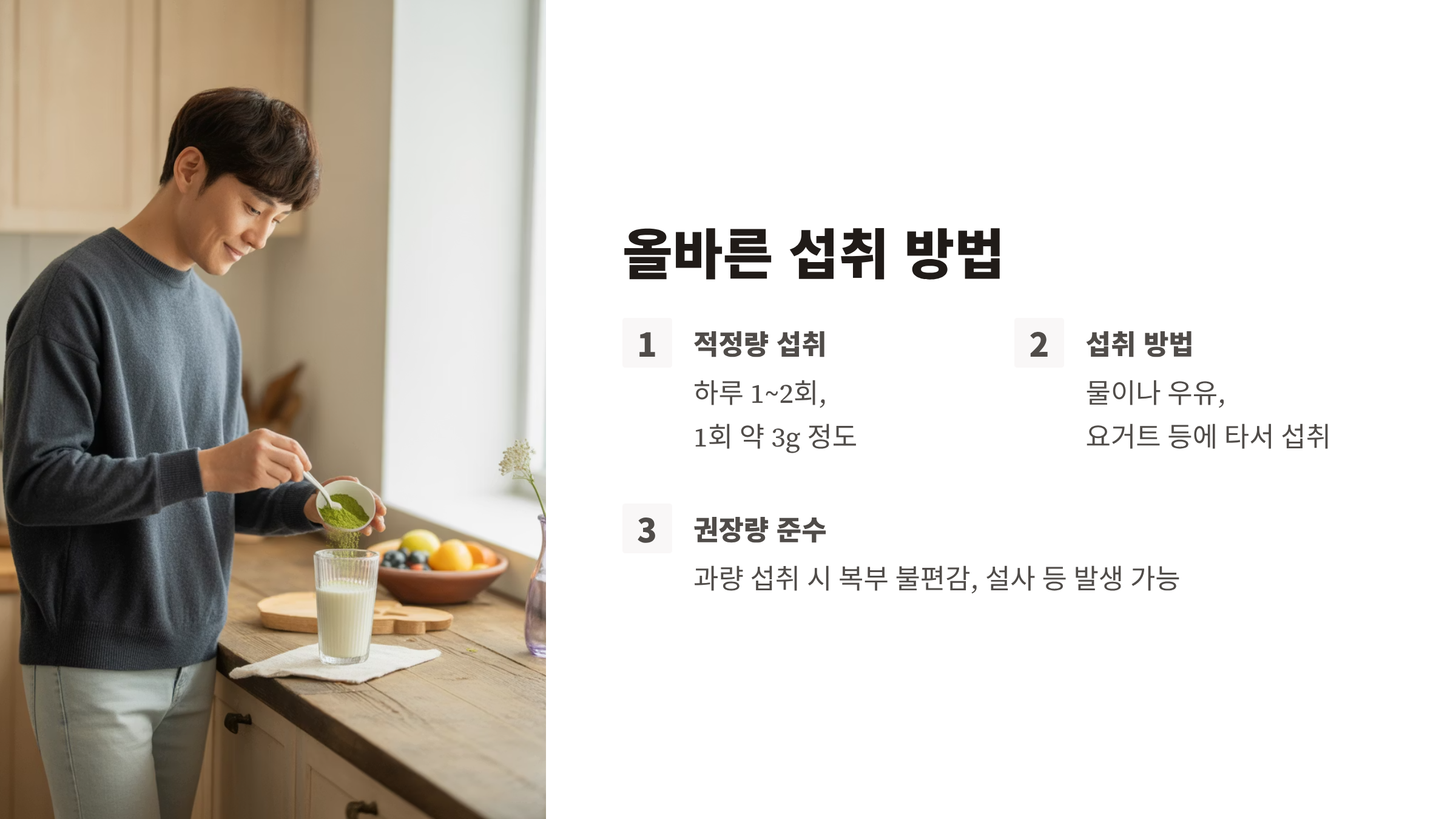 - 일반적으로 하루 1~2회, 1회 약 3g 정도를 물이나 우유, 요거트 등에 타서 섭취합니다.