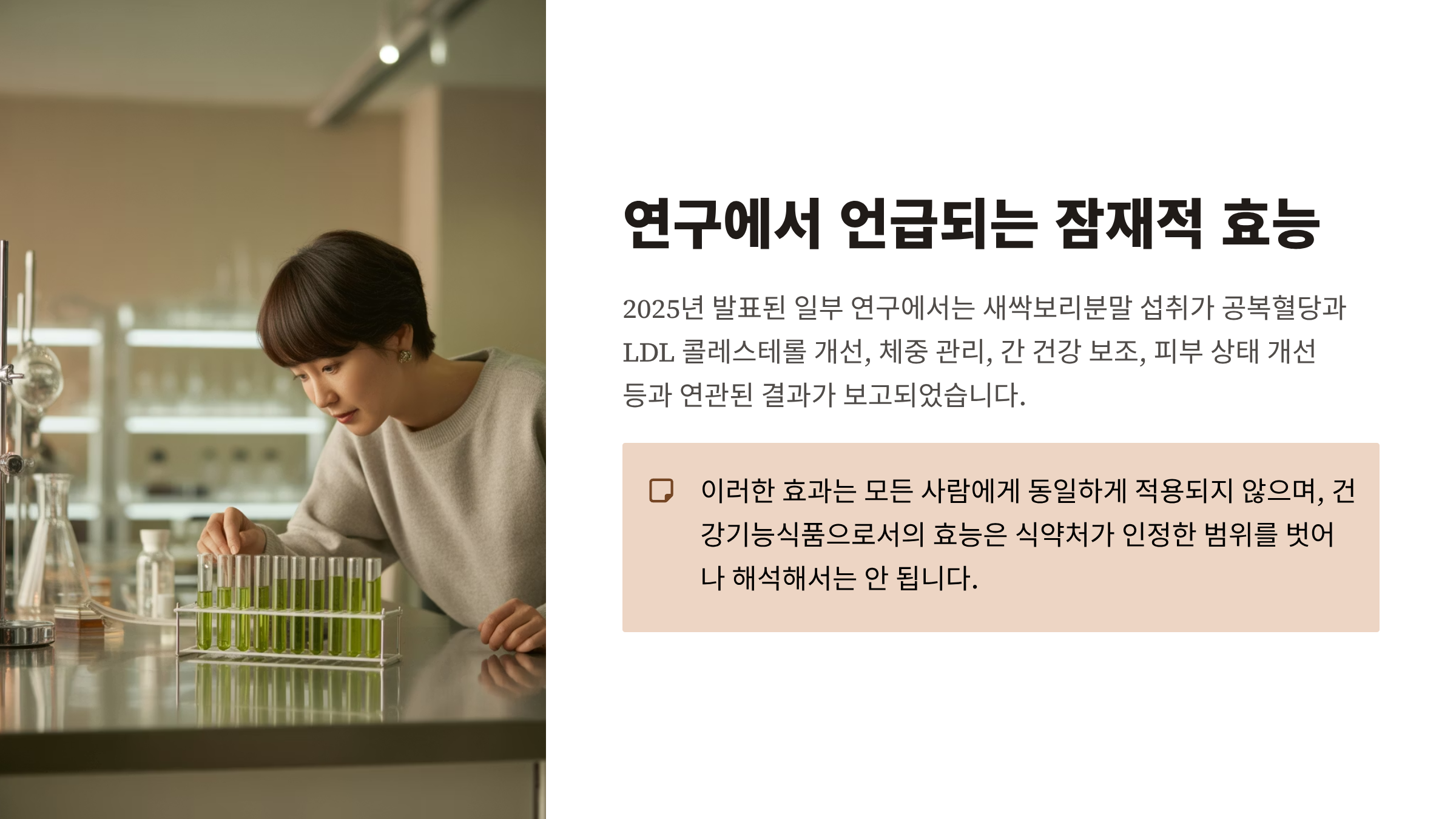2025년 발표된 일부 연구에서는 새싹보리분말 섭취가 공복혈당과