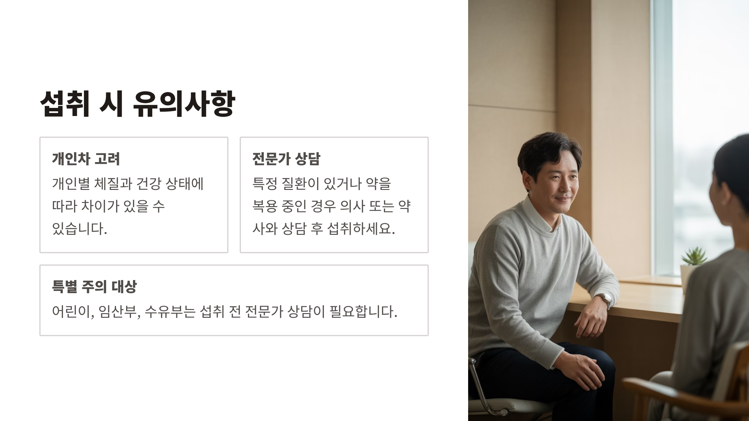 - 다른 건강보조제나 약물을 복용 중이라면 전문가 상담 후 섭취하는 것이 안전합니다.