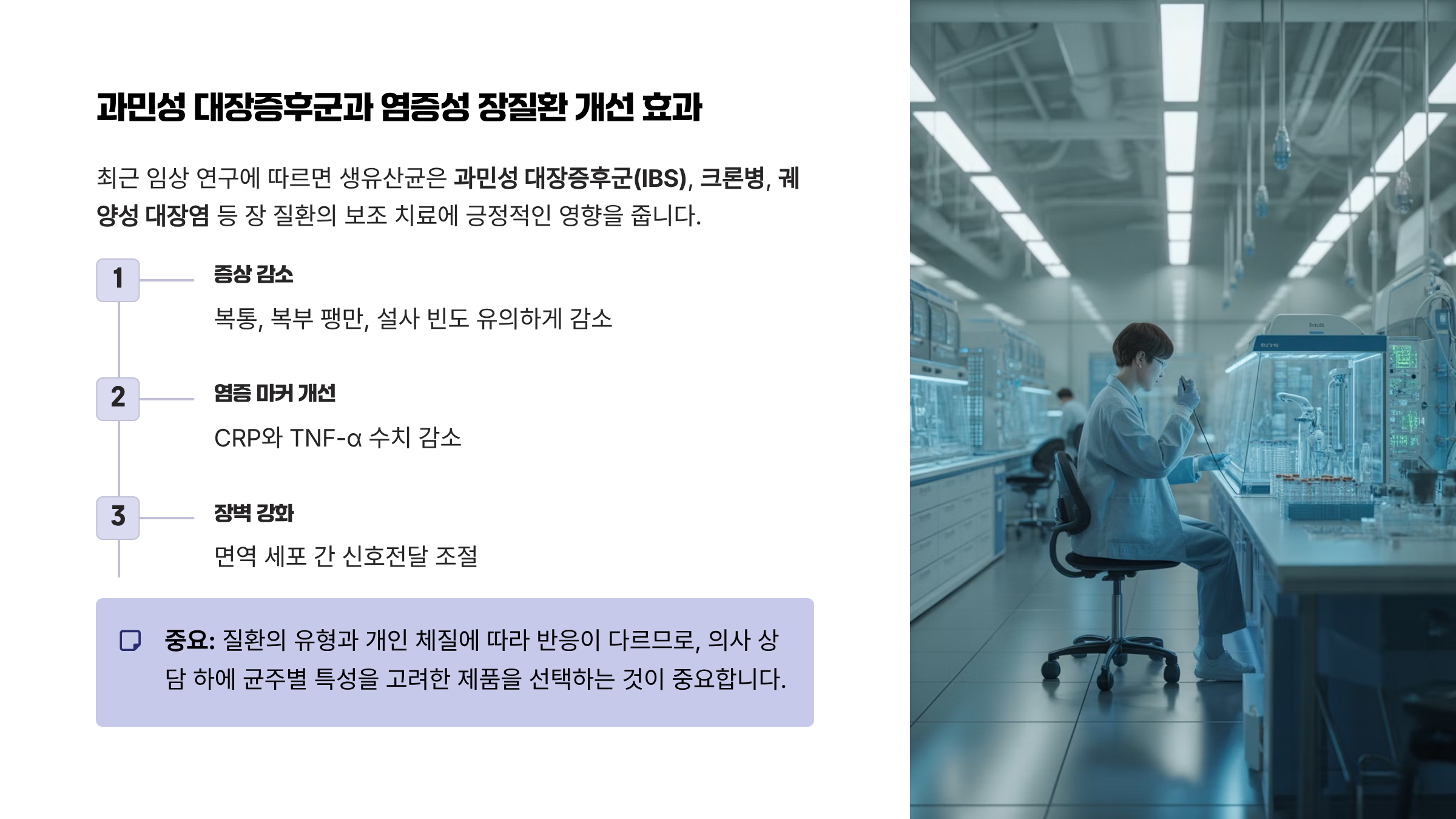 최근 임상 연구에 따르면 생유산균은 과민성 대장증후군(IBS), 크론병, 궤양성 대장염 등