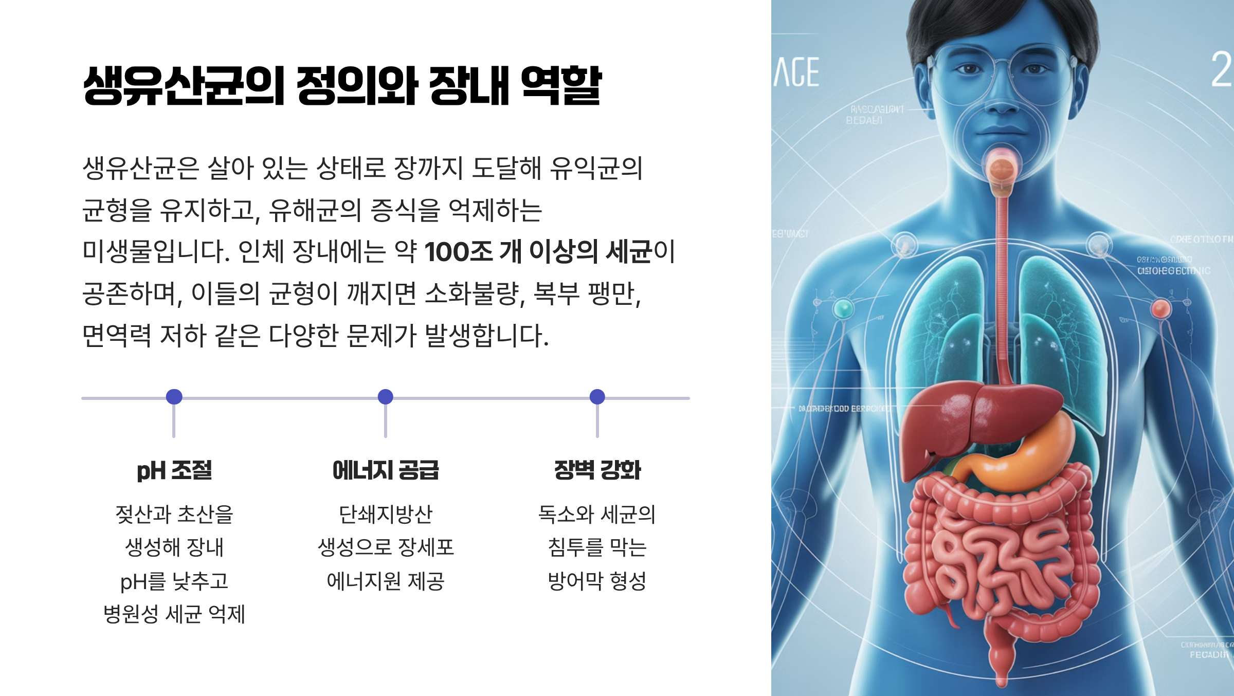 생유산균은 이러한 장내 미생물 생태계를 조절하는 핵심 인자로,