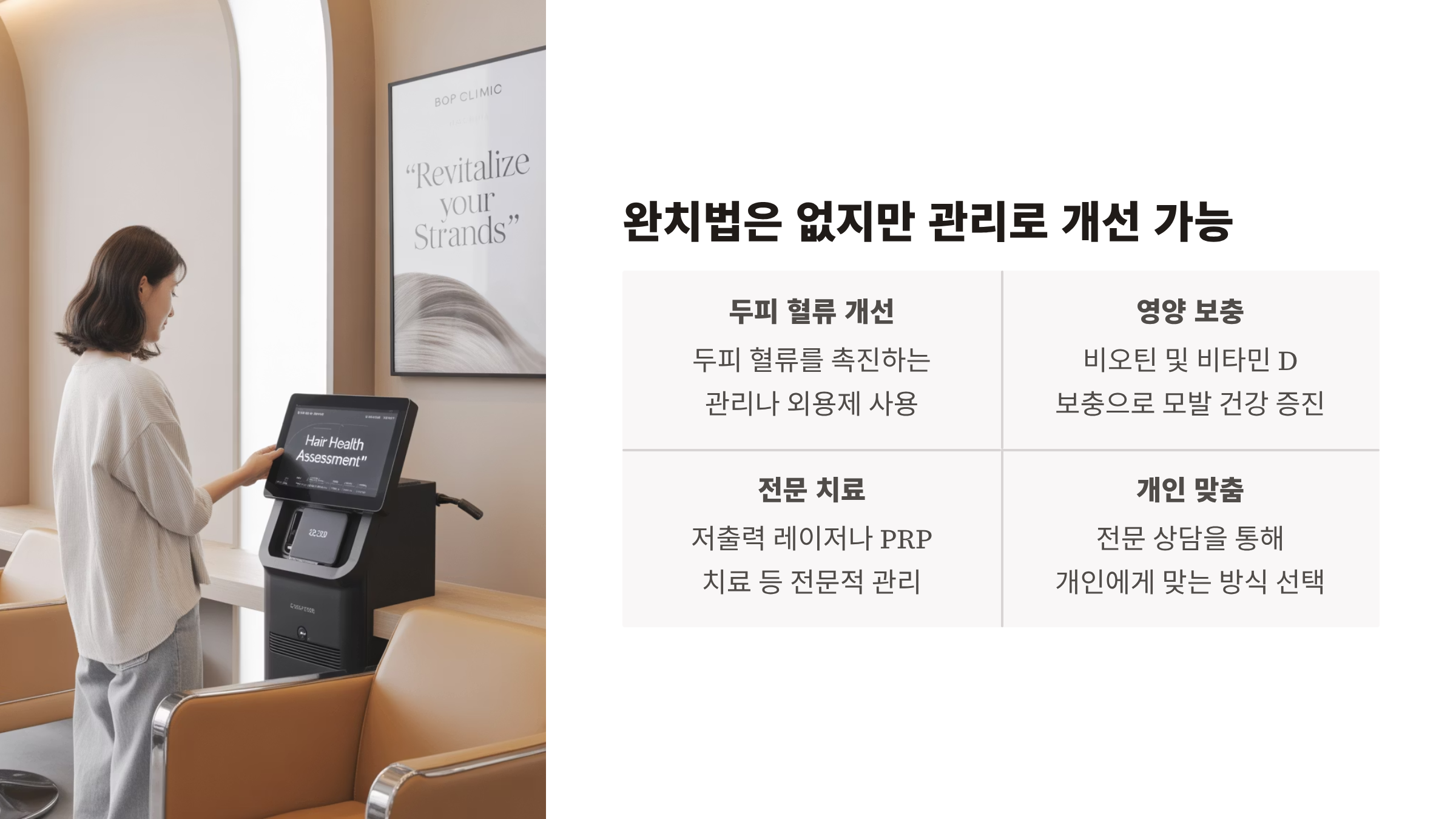 그리고 저출력 레이저나 PRP 치료 등이 도움될 수 있어요.