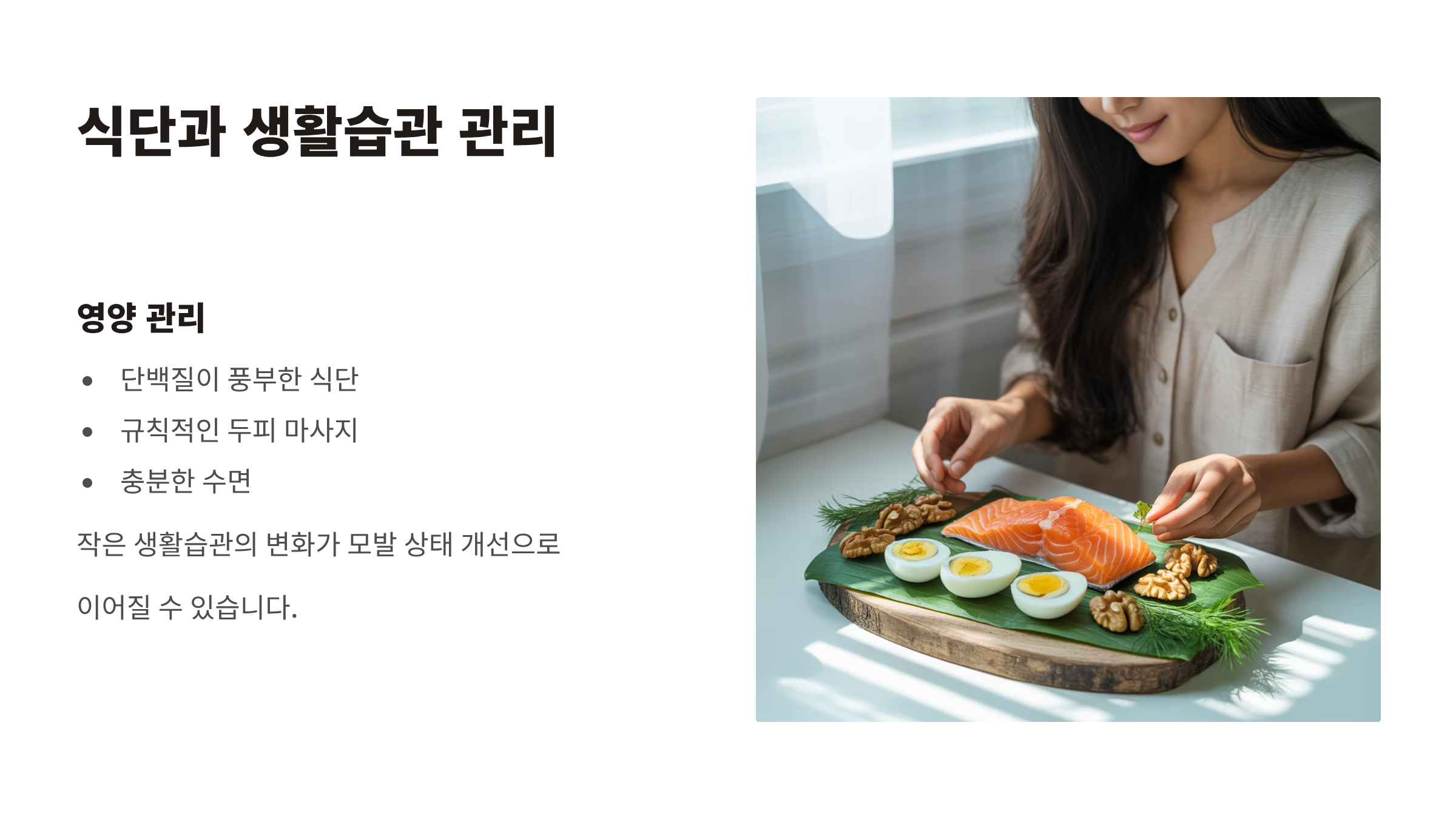 | 식단·영양 | 단백질 섭취, 비오틴·비타민 D 보충 |