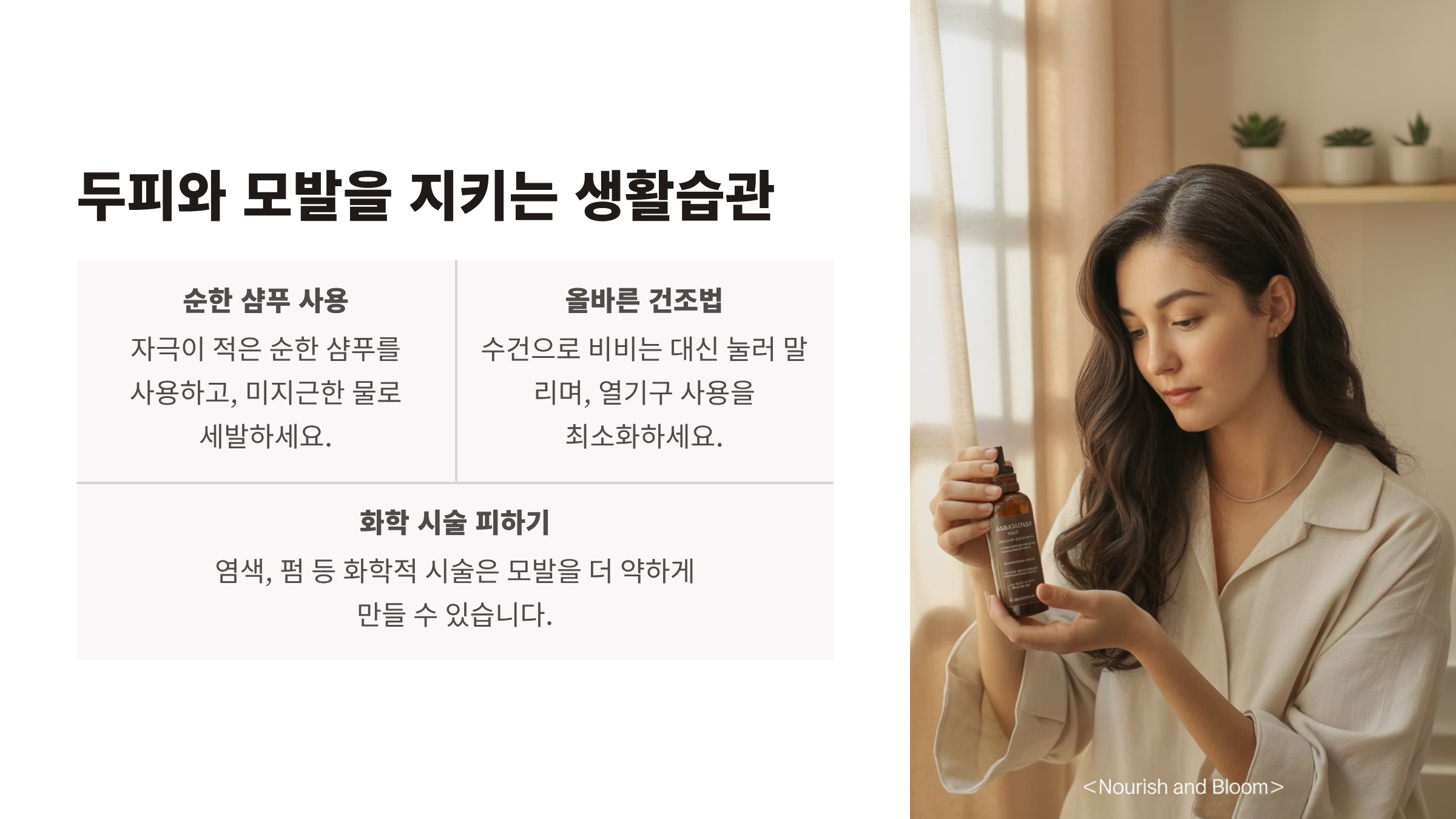 | 생활습관 | 순한 샴푸, 열기구 최소화, 화학 시술 피하기 |