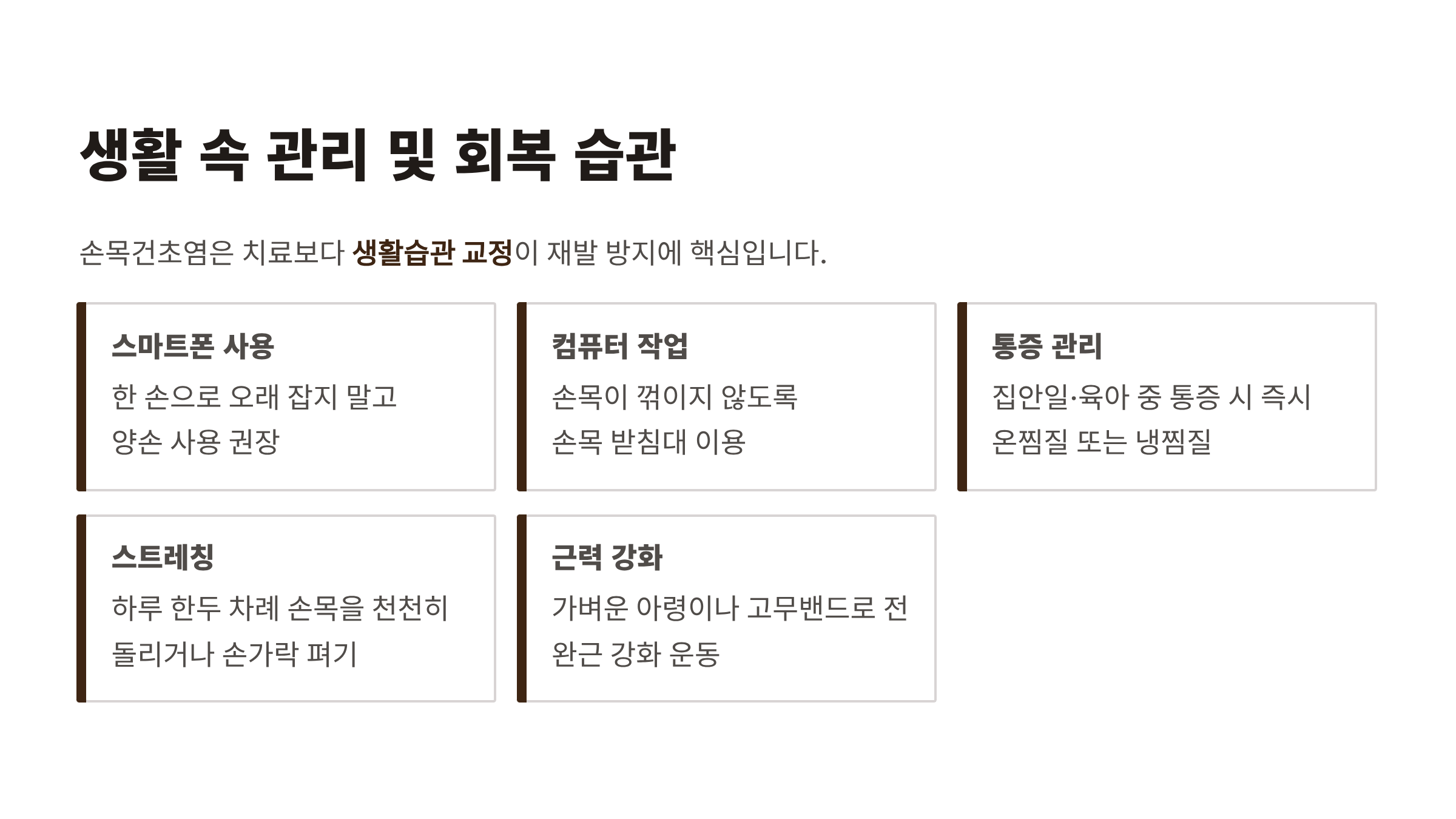 손목건초염은 치료보다 생활습관 교정이 재발 방지에 핵심이다.