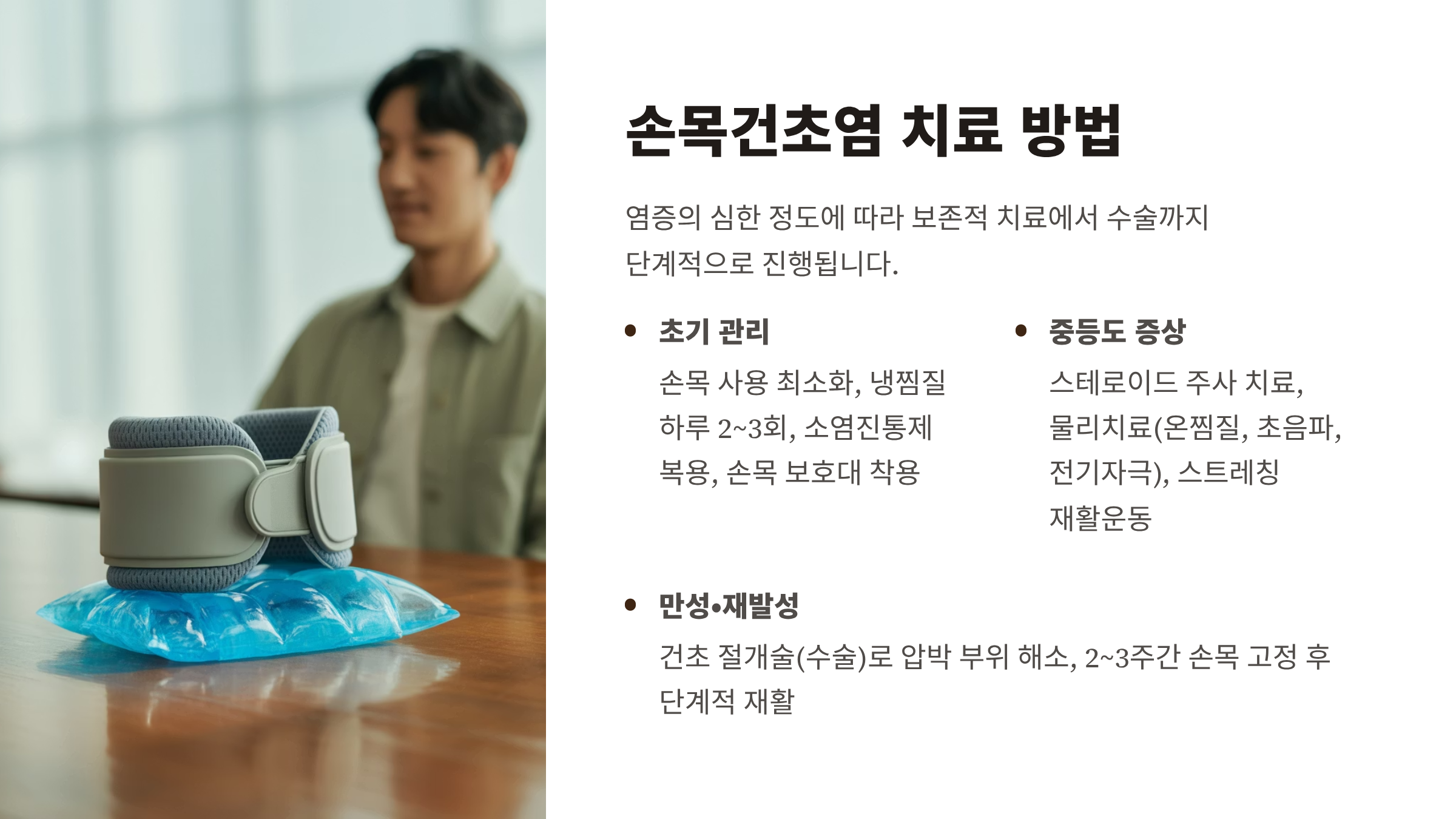 | 초기 | 손목 사용 시 통증, 시큰거림 | 휴식 시 완화되며 부기 없음 |