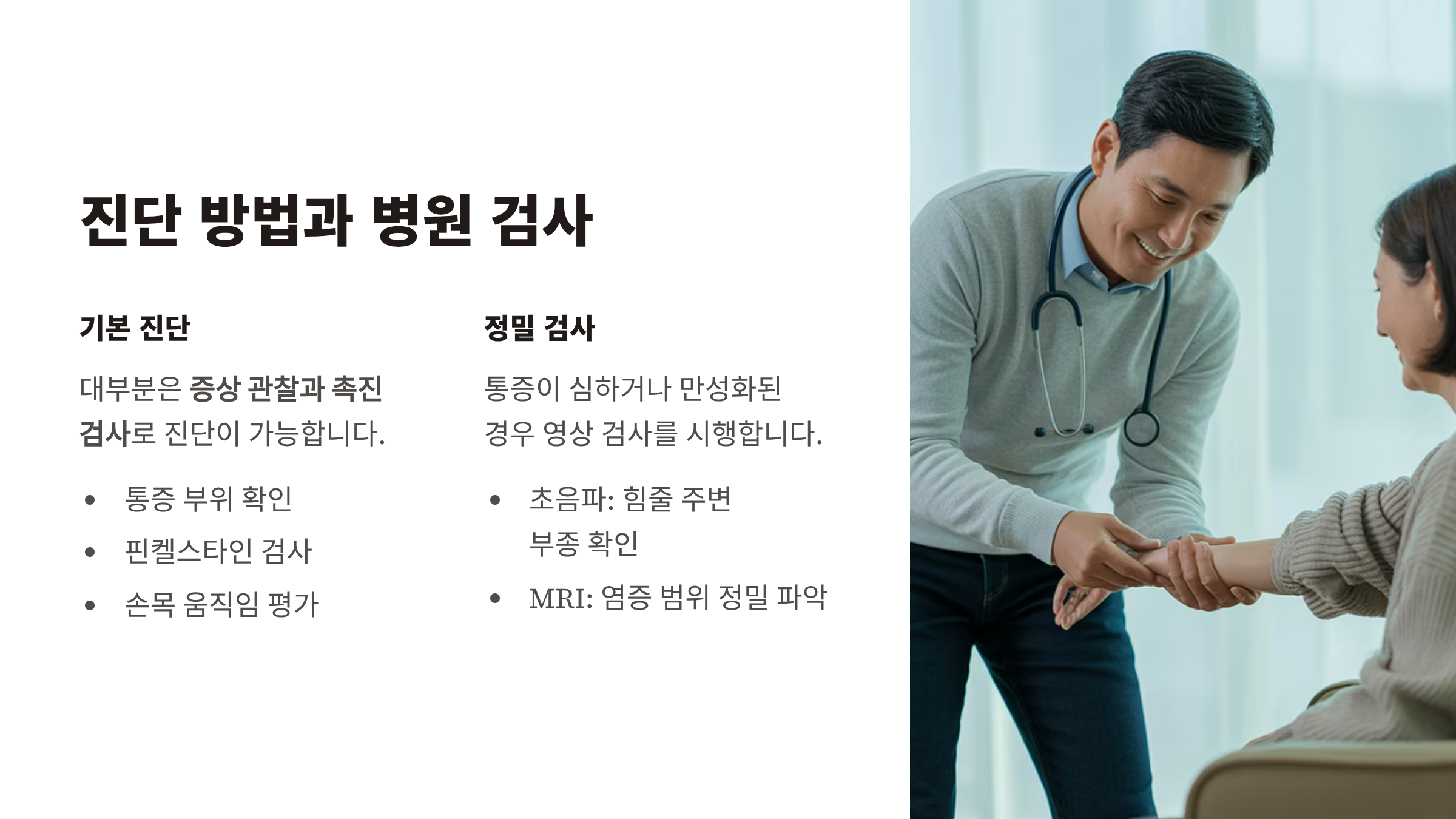 | 중기 | 통증 지속, 손목 외측 붓기 | 컵·휴대폰 등 가벼운 물건도 잡기 힘듦 |