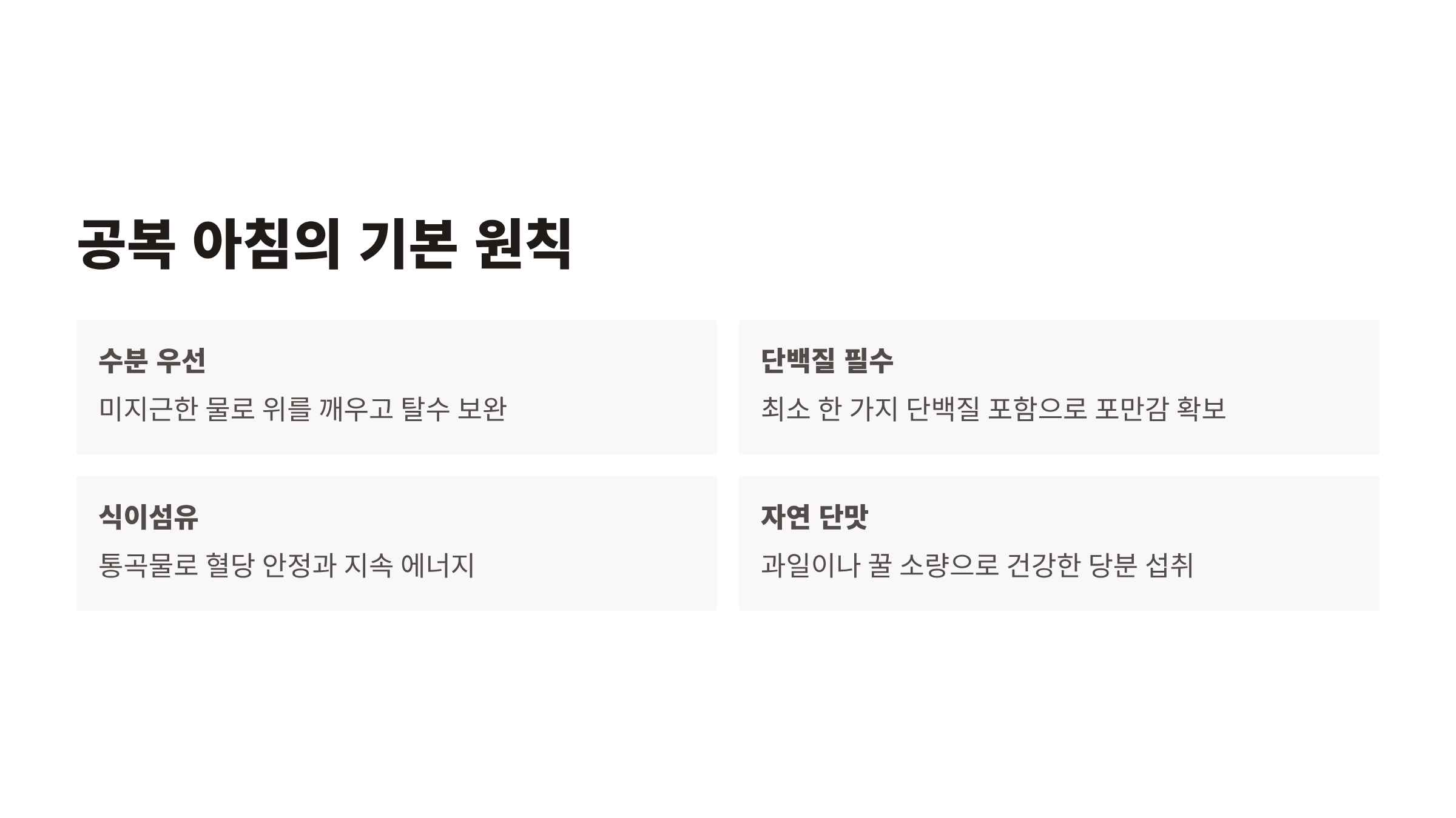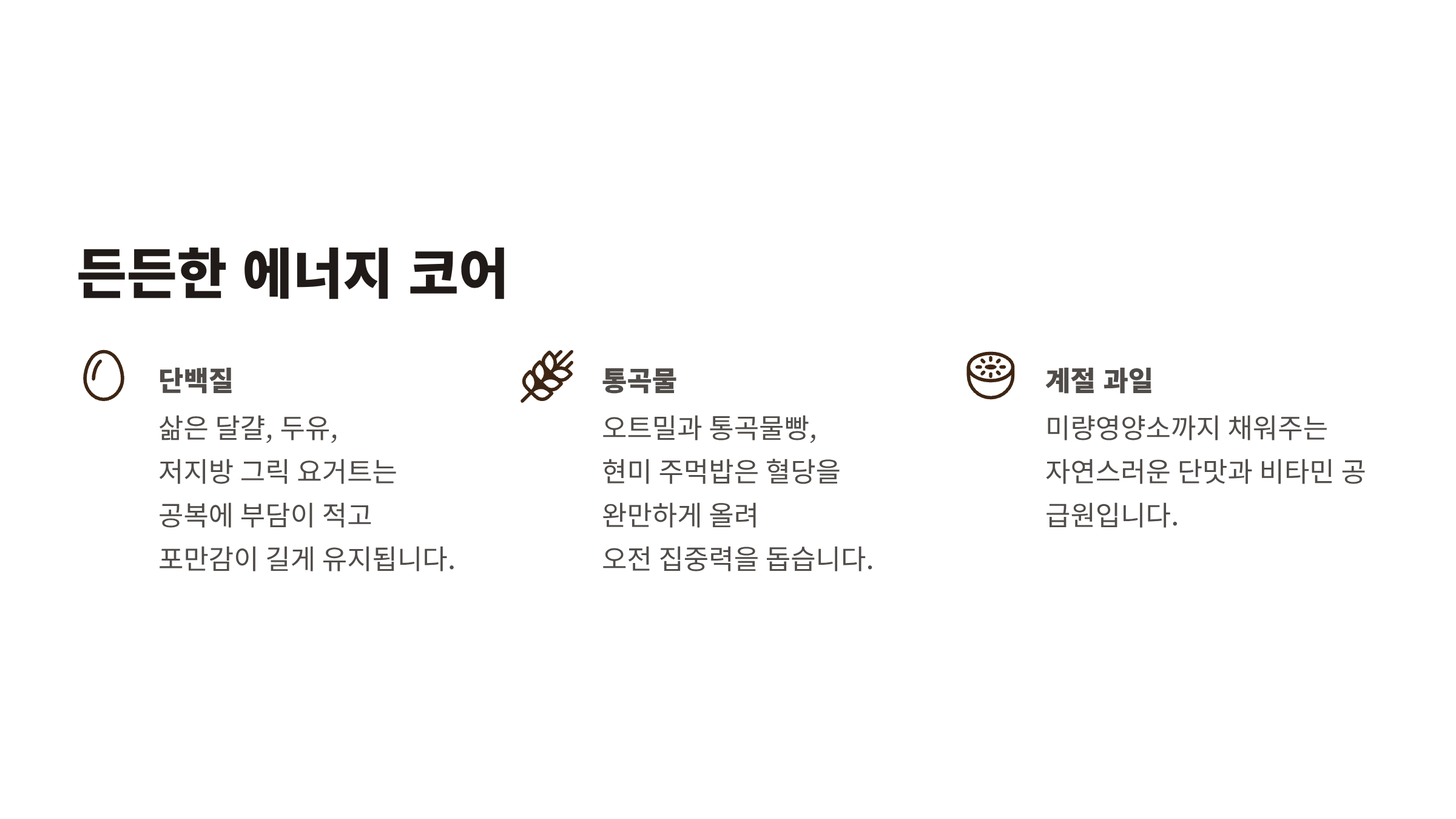 | 단백질 | 삶은 달걀, 그릭요거트, 두유 | 포만감 유지, 근육 보호 |