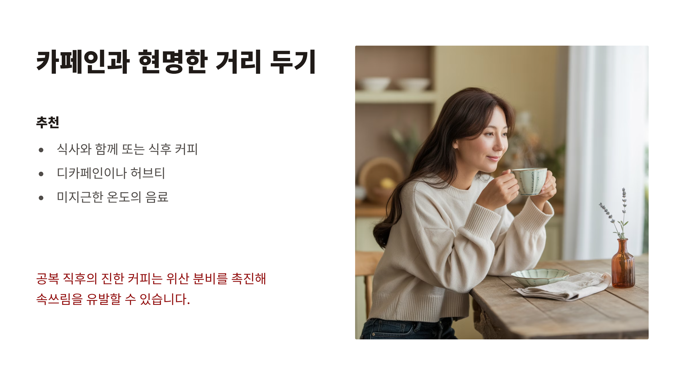 카페인은 식사 후로 미루고, 너무 차가운 음료는 피해서 위 부담을 줄입니다.