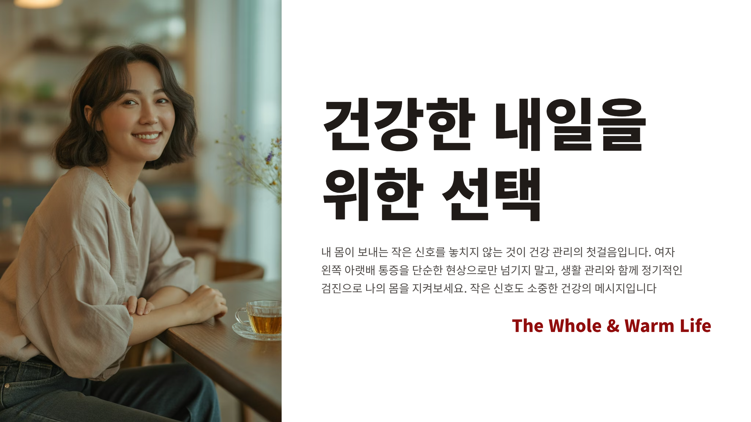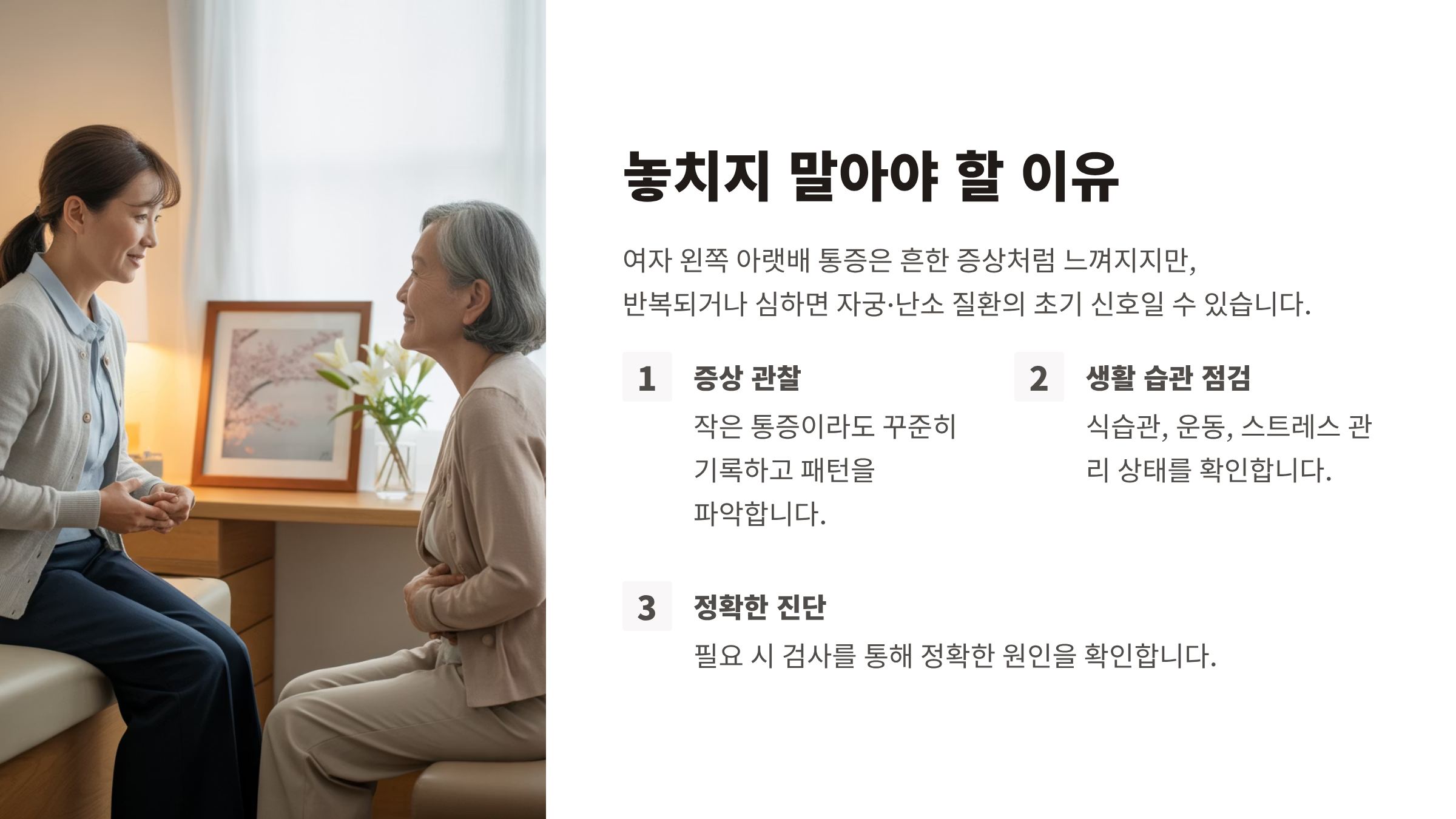내 몸이 보내는 작은 신호를 놓치지 않는 것이 건강 관리의 첫걸음입니다. 여자 왼쪽아랫배 통증을 단순한 현상으로만 넘기지 말고, 생활 관리와 함께 정기적인 검진으로 나의 몸을 지켜보세요.