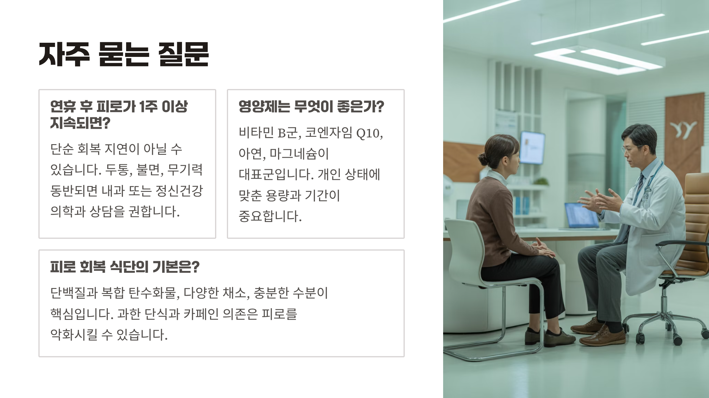 연휴 후 피로가 1주 이상 지속되면 단순 회복 지연이 아닐 수 있다. 두통 불면 무기력이 동반되면 내과 또는 정신건강의학과 상담을 권한다.