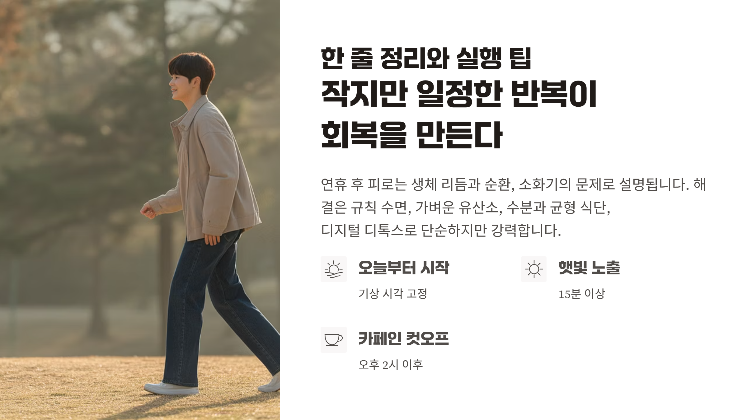 연휴 후 피로는 생체 리듬과 순환 그리고 소화기의 문제로 설명된다. 해결은 규칙 수면 가벼운 유산소 수분과 균형 식단 그리고 디지털 디톡스로 단순하지만 강력하다. 오늘은 기상 시각 고정과 햇빛 노출 15분 그리고 오후 카페인 컷오프부터 시작하자. 작지만 일정한 반복이 회복을 만든다.