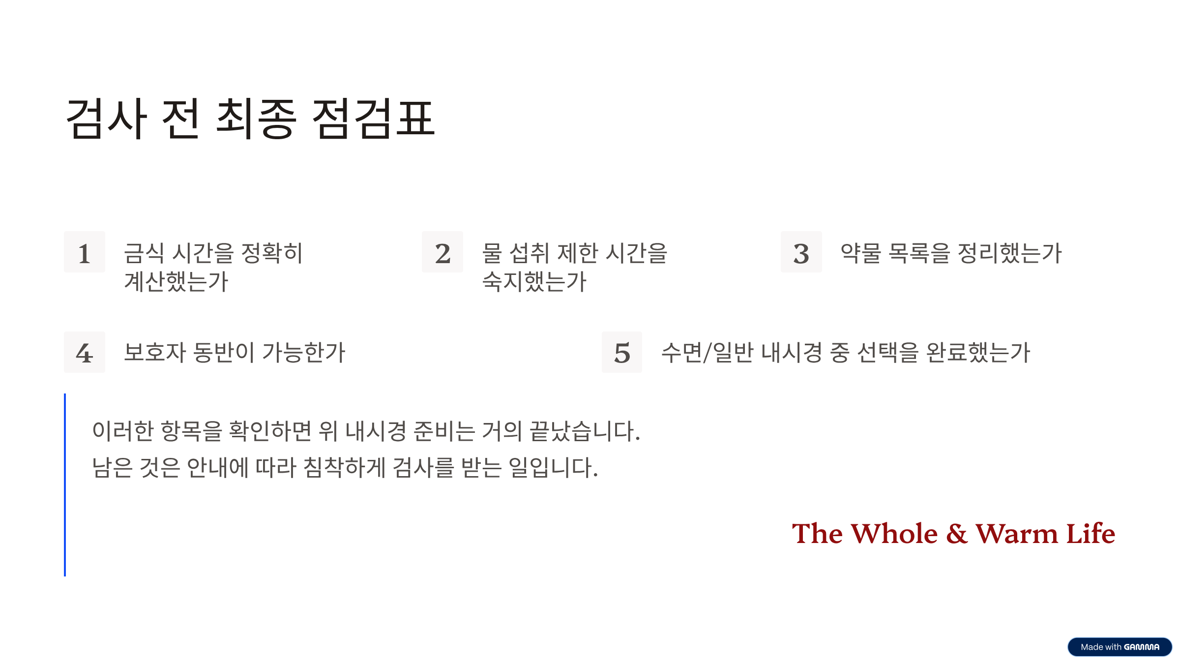 나는 금식 시간을 정확히 계산했는가. 물 섭취 제한 시간을 숙지했는가. 약물 목록을 정리했는가. 보호자 동반이 가능한가. 수면 내시경과 일반 내시경 중 나에게 맞는 선택을 했는가. 이러한 항목을 확인하면 위 내시경 준비는 거의 끝났다. 남은 것은 안내에 따라 침착하게 검사를 받는 일이다.