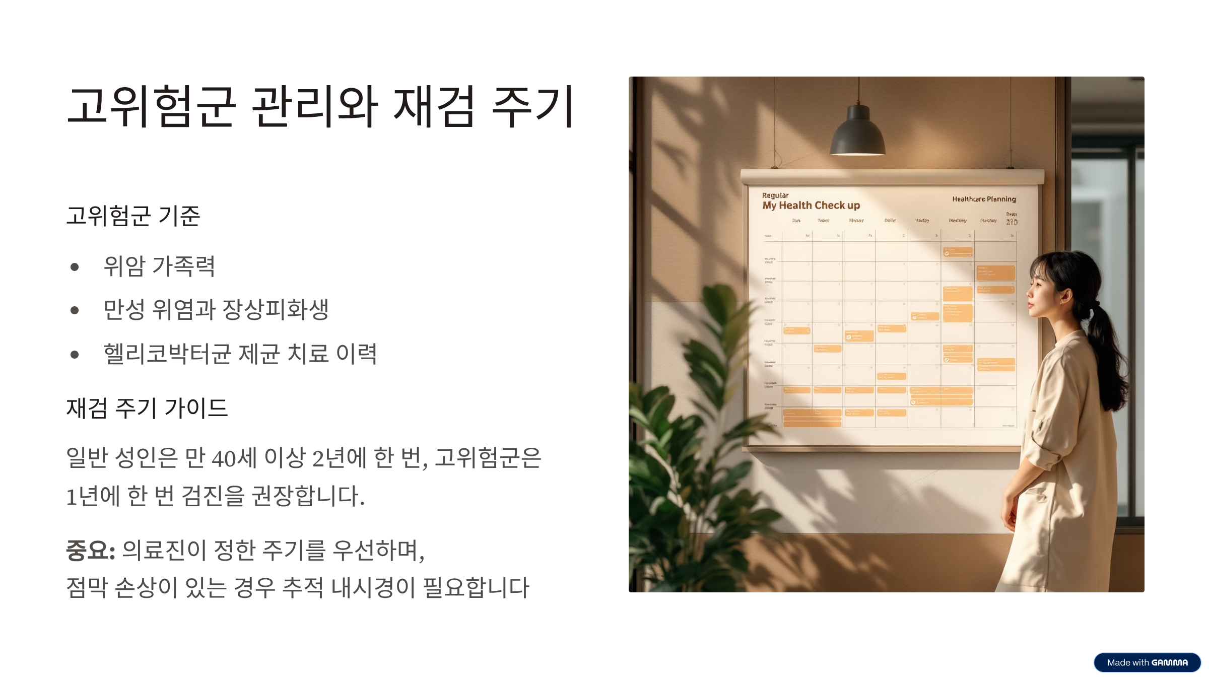 위암 가족력이 있거나 만성 위염과 장상피화생 같은 점막 이상이 있으면 추적 내시경이 필요하다. 헬리코박터균 제균 치료를 받았어도 점막 손상이 남을 수 있다. 의료진이 정한 주기를 우선한다. 일반 성인은 만 40세 이상 2년에 한 번을 기준으로 삼을 수 있다. 고위험군은 1년에 한 번 같은 촘촘한 주기를 고려한다.