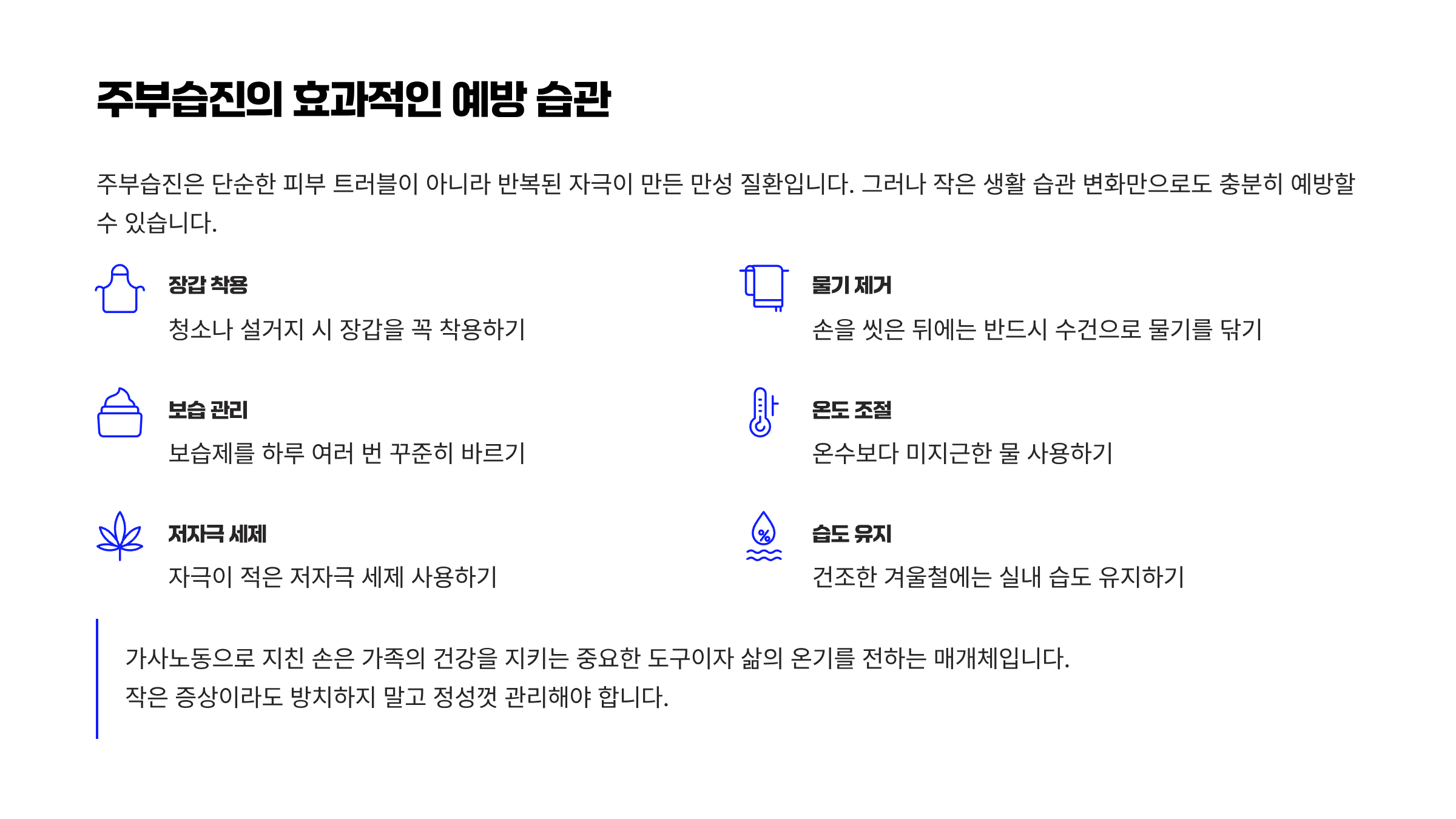 - 청소 후에는 손을 충분히 건조시키고 보습제 바르기