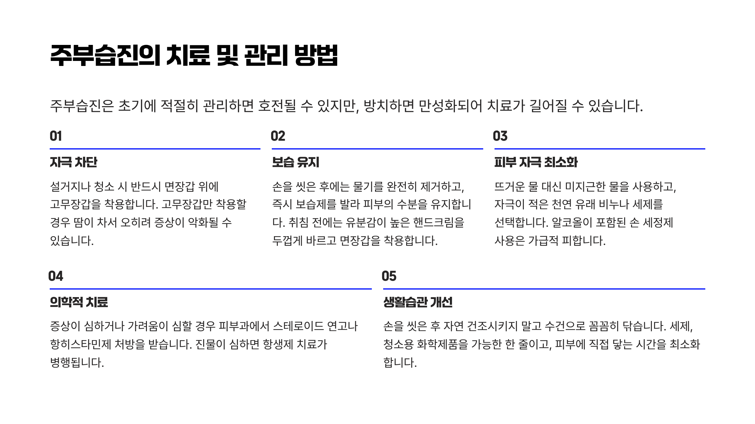 꾸준한 관리와 관심으로 주부습진 없는 건강한 손을 회복하시길 바랍니다.